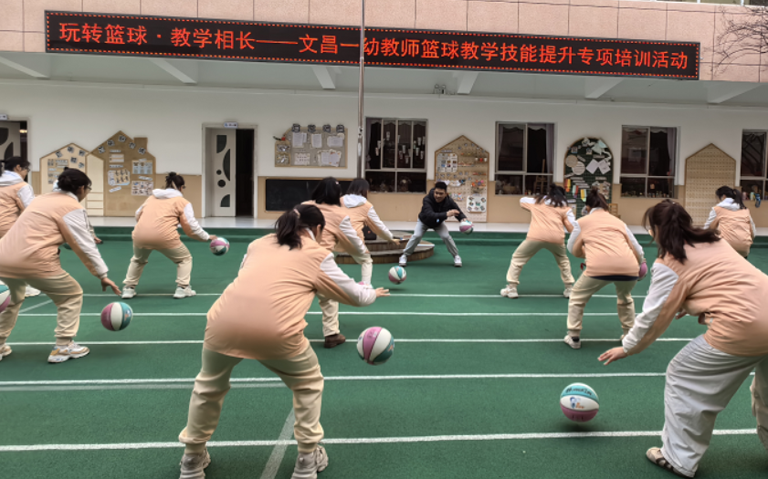 两个层面进行培训。教练从原地运球、行进间运球、传球到投篮,进行了细致的动作分解与教学要点剖析,特别强调各年龄段幼儿的身心发展特点与相应的教学重点,并针对幼儿活动中常见的错误动作提供了科学的纠正方法与安全保护指导;学习简化版的3V3比赛规则,并示范如何将其融入幼儿可理解、可参与的游戏情境中,通过组织小型模拟比赛,教师们亲身体验了游戏化竞赛的组织流程,教师们认真听讲,反复练习,在实操中体会动作发力的关键,确保自身动作规范,为后续科学指导幼儿奠定坚实基础。
