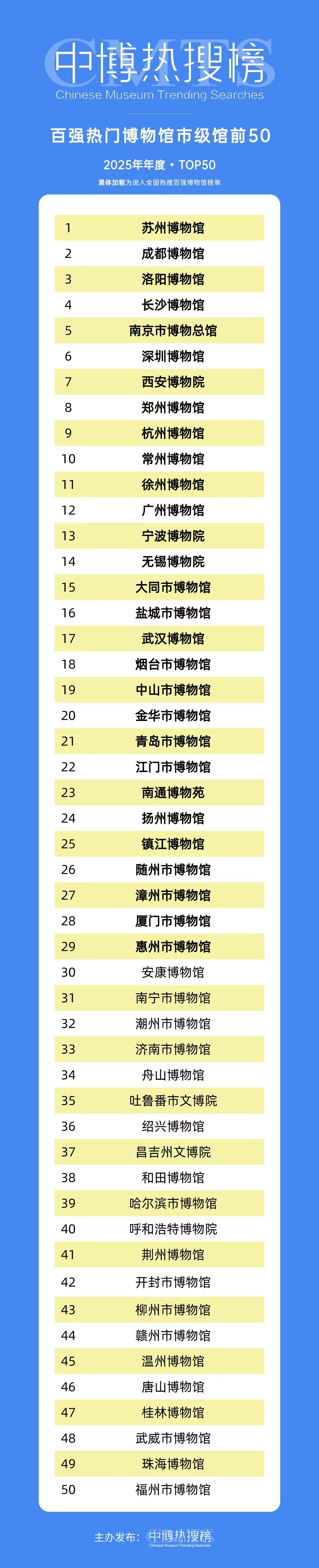 中博热搜榜由中国文物交流中心指导、博物馆头条统计发布,数据基于全网实时抓取和AI模型分析。2025年中博热搜榜分为多类榜单,包括全国热门博物馆百强、热门展览百强(如基本陈列、临展)、地区性榜单及专题榜单等。榜单按季度(第一季度至第三季度)和年度发布,覆盖全国6565家备案博物馆。