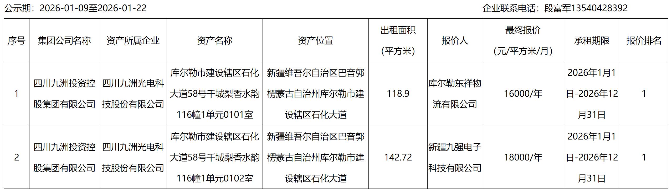 四川九洲光电科技股份有限公司资产出租结果公示
