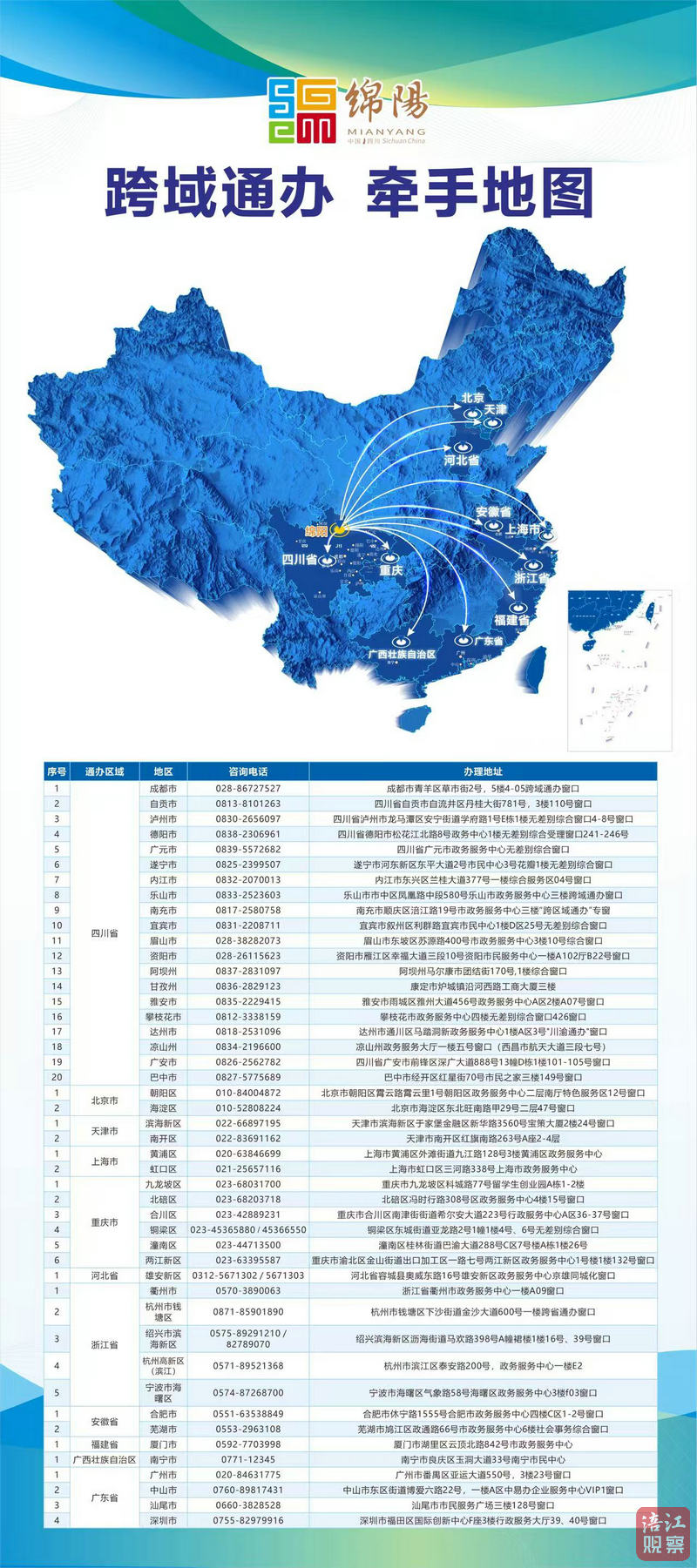 目前,绵阳已与川内20地、重庆6地及省外京津冀、长三角、粤港澳大湾区等20地建立协作机制,形成覆盖省内、川渝、跨省的多层次通办网络,梳理出企业登记、社保医保、不动产登记等1300余项高频通办事项,并建立通办合作与通办事项动态调整等机制,让服务更贴合需求。