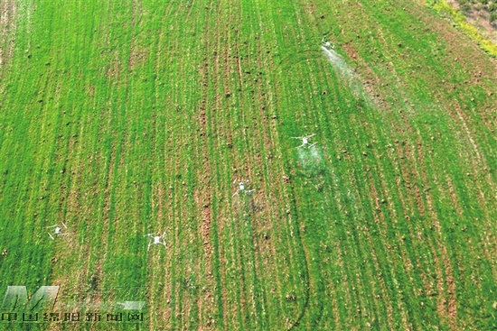 无人机“组团”腾空而起,将药雾精准洒向麦苗。记者 刘凤君 摄