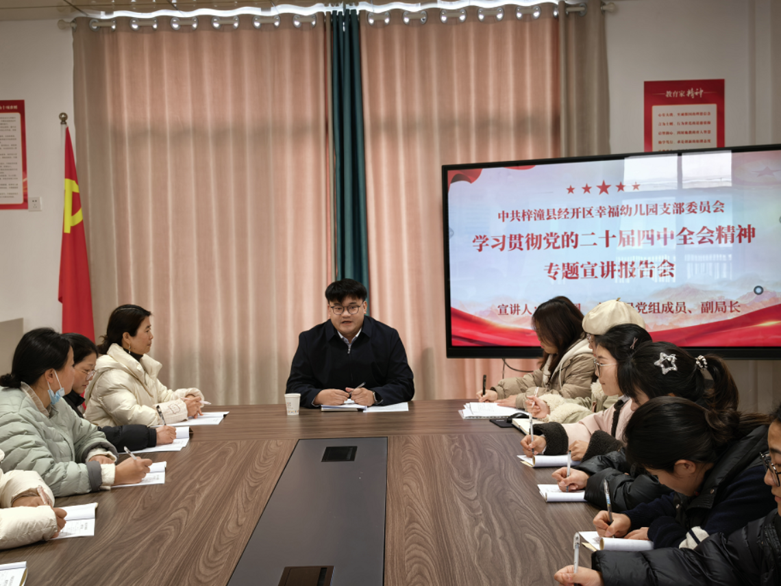 为了精准传递党的二十届四中全会精神内核,切实统一全园教职工思想行动,筑牢幼儿园高质量发展的思想根基,1 月 13 日,梓潼县教体局党组成员、副局长黄国园莅临幸福幼儿园,面向全体教职工开展了以“深化思想引领 凝聚发展合力”为主题的宣讲会活动。宣讲会紧扣全会精神实质,深度融合学前教育实践,为全园教职工带来了一场兼具理论高度与实践温度的思想盛宴。