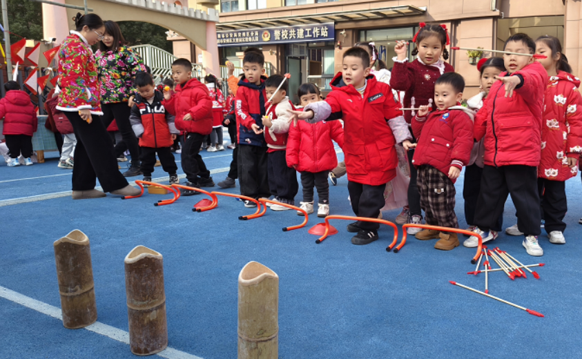 游园环节将活动推向高潮。星园变身为“新春乐园”,设置了十项融合马年文化与运动趣味的关卡:“马‘拓’飞燕”让幼儿拓印福字,感受传统艺术;“策马奔腾”需用扇子驱动气球马前进,锻炼协调能力;“趣味套马”“一马当先”等游戏则激发幼儿的竞赛意识与合作精神。孩子们身着红色节日服装,在闯关中积累“星币”,体验成功喜悦。