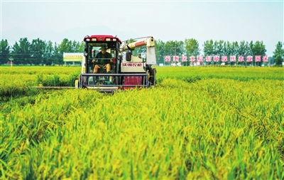安州区水稻制种现代农业园区机器收割。