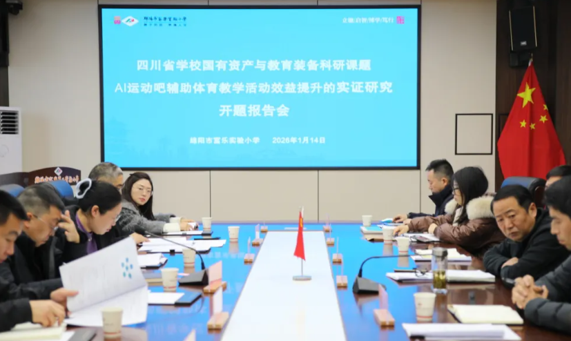 绵阳新闻网讯 为了深入推进教育信息化与体育教学深度融合,探索人工智能技术赋能体育教学的新路径,2026年1月14日,绵阳市富乐实验小学举行了以“智慧赋能,育体强身”为主题的四川省学校国有资产与教育装备科研省级课题“AI运动吧辅助体育教学活动效益提升的实证研究”开题报告会。会议特邀绵阳市电化教育馆副馆长付入林老师、绵阳市电化教育馆教育装备科科长苏飞老师、绵阳师范学院体育学院吴薇教授、绵阳市教育科学研究所体育与健康教研员刘熠熠老师、万达学校体育教师田俊辉老师组成专家评审组,对课题进行专业指导。课题组全体成员共同参与了此次学术活动。