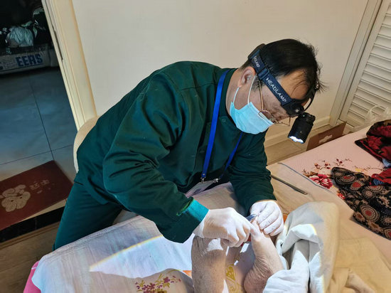 护理员王新中正在为侯阿姨的老伴提供修脚服务。受访者供图