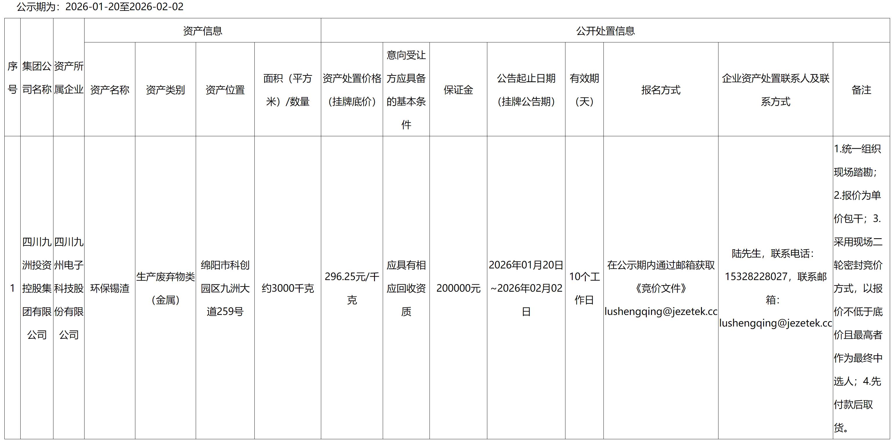 四川九州电子科技股份有限公司2026年1批次环保锡渣资产处置公告