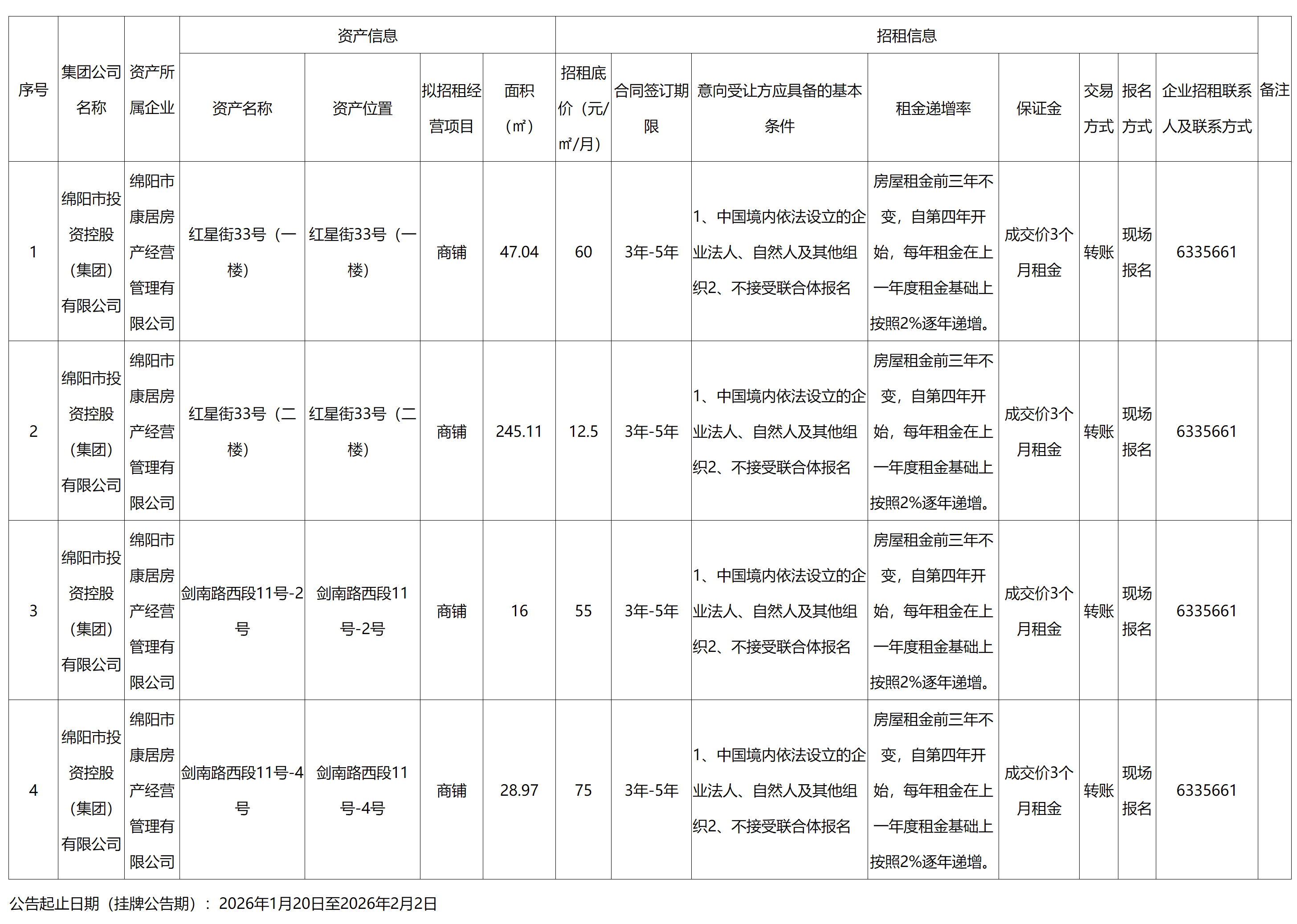 绵阳市康居房产经营管理有限公司资产出租公告
