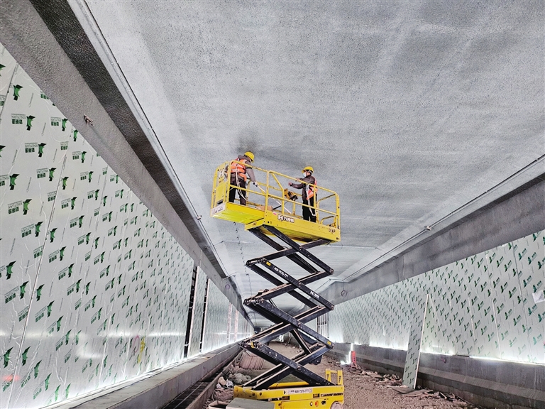 该项目包括临园路下穿隧道工程和站前广场改造工程两部分。其中,临园路下穿隧道工程已于1月5日完成主体结构,计划春节前实现通车。“目前隧道施工已进入收尾冲刺阶段,U型槽侧墙石材已经装完,截水沟和防撞石施工已于1月22日完工。同时,照明、监控将在本月底安装完毕,侧墙装饰板材将在1月28日完工,地面找平也在稳步推进,顶板土方回填有序进行,预计春节前达到通车条件。”海丹介绍,下穿隧道在设计时,还预留了一条南北走向的人行下穿隧道。待站前广场改造工程完工,该隧道将直接连通站前广场负一楼。届时,出站旅客可通过人行下穿隧道横穿临园干道。