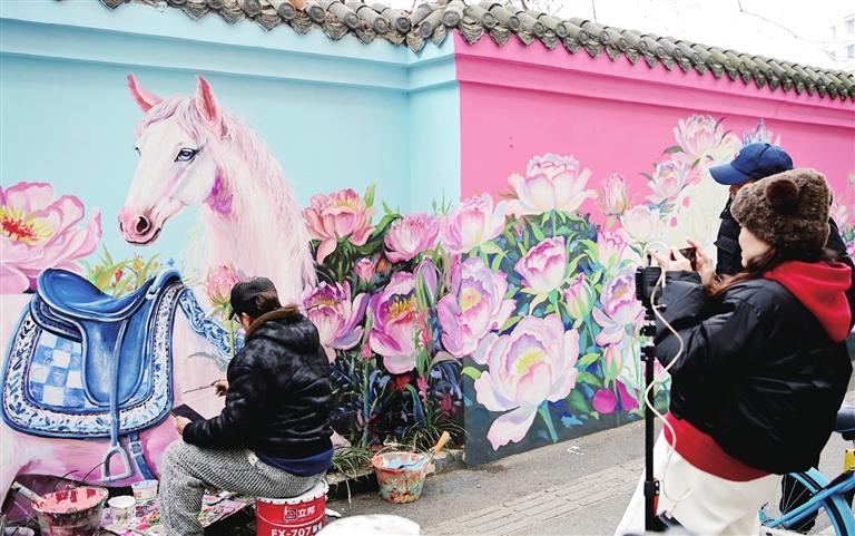 美术师在墙上创作的《骏马图》,吸引了市民的目光。