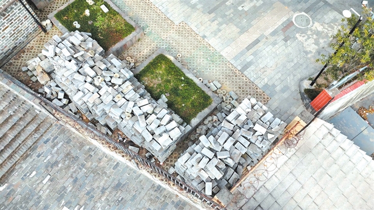 这些废砖从何而来?据居民反映,砖块并非无主之物。小区旁的南城门墙属明代遗址,2022年,为阻止人员进入尚未开放的遗址区域,平武县相关部门曾在此砌筑了一段长20余米,高3米的挡墙。2023年,考虑到南城门墙的美观度,该挡墙被整体拆除,拆下来的砖块便被堆放在小区绿化带内,自此无人问津。