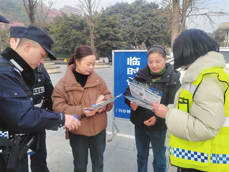 绵阳新闻网讯 年味渐浓,平安为要。随着新春的脚步临近,连日来,市公安局特巡警支队巡逻四大队民警与滨涪社区工作人员都会早早前往辖区圣水寺等游客密集地,以“发传单+口头宣讲”的形式,开展反诈、防盗安全宣传活动,将实用安全知识送到群众身边。