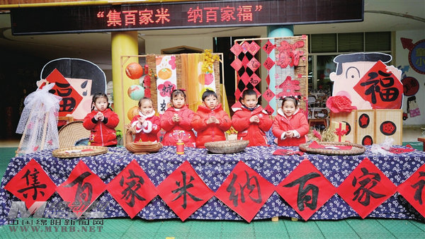 三台县机关幼儿园的孩子们体验“集百家米纳百家福”民俗。 记者 刘凤君 摄