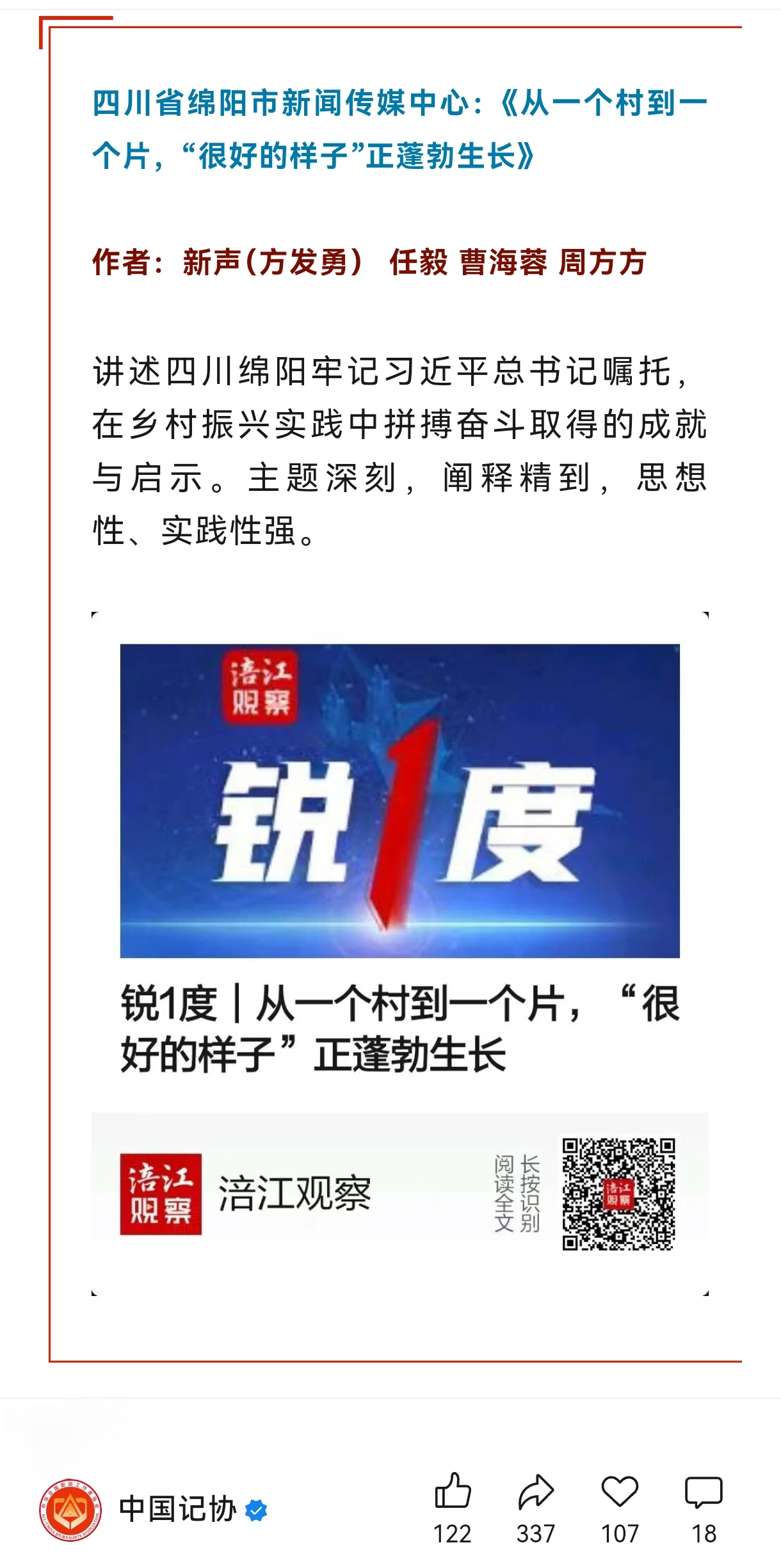 1月26日,中国记协官方微信公众号发布推文《上榜了!恭喜代表作》(详情请戳),对“我的代表作”栏目第九十三期入选作品进行展示。绵阳市新闻传媒中心作品《从一个村到一个片,“很好的样子”正蓬勃生长》入选。全文如下: