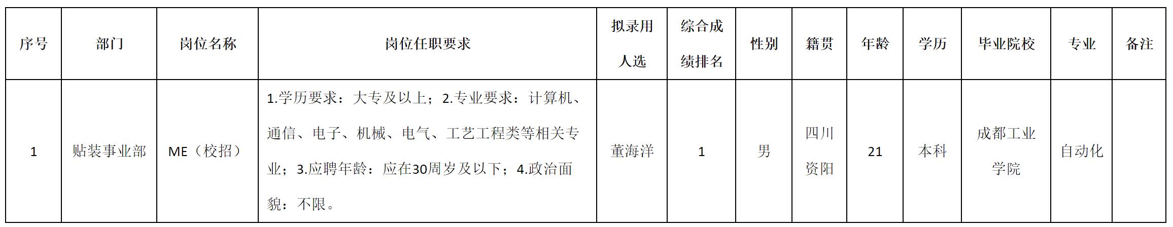 根据四川九州电子科技股份有限公司发布的招聘公告及招聘相关规定,经测试、考察、体检等程序,拟录用董海洋同志到四川九州电子科技股份有限公司工作,现予以公示,具体情况如下: