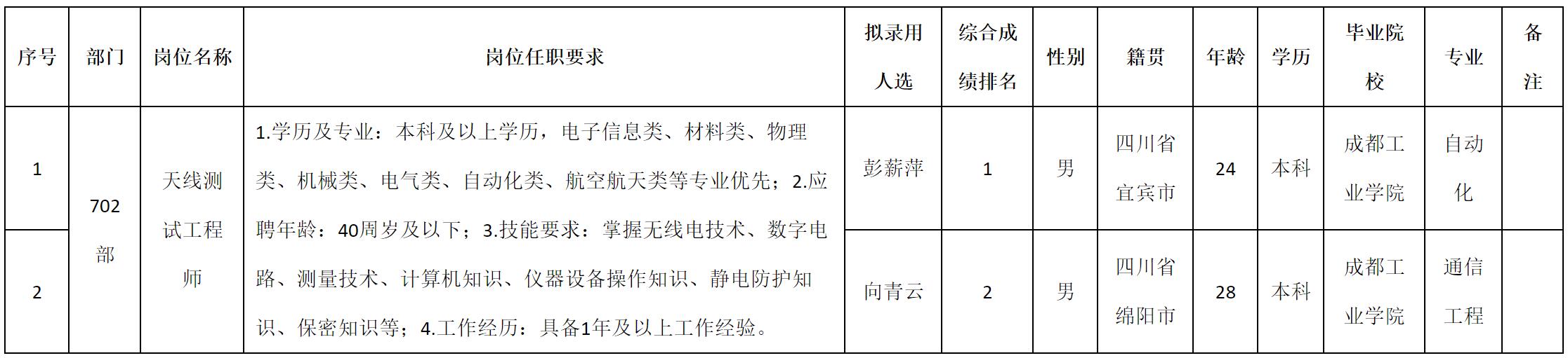根据四川九洲电器集团有限责任公司发布的招聘公告及招聘相关规定,经测试、考察、体检等程序,拟录用彭薪萍等2名同志到四川九洲电器集团有限责任公司工作,现予以公示,具体情况如下: