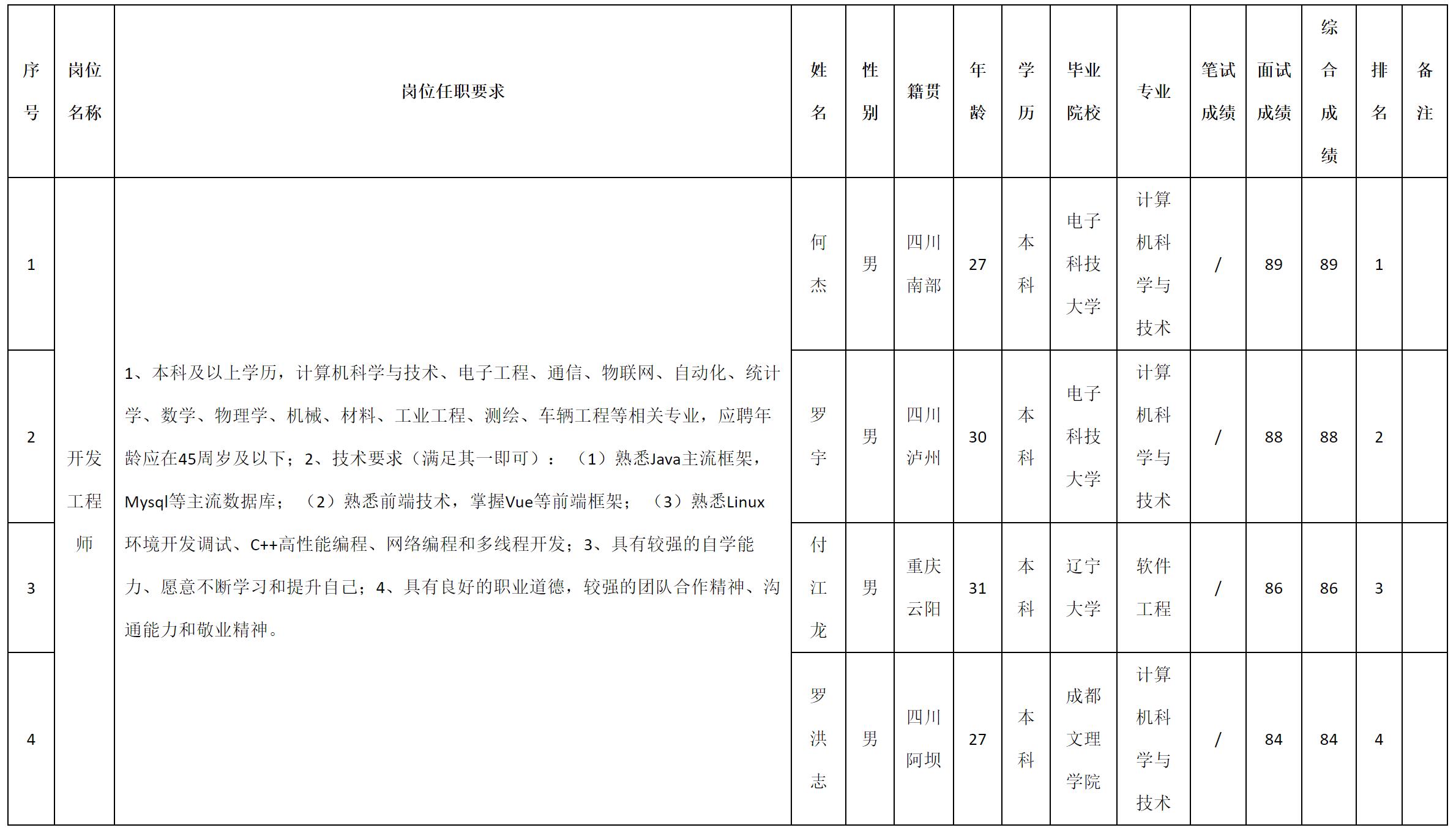 根据四川九洲投资控股集团有限公司软件与数据智能产业发布的招聘公告及招聘相关规定,现将测试成绩予以公示。
