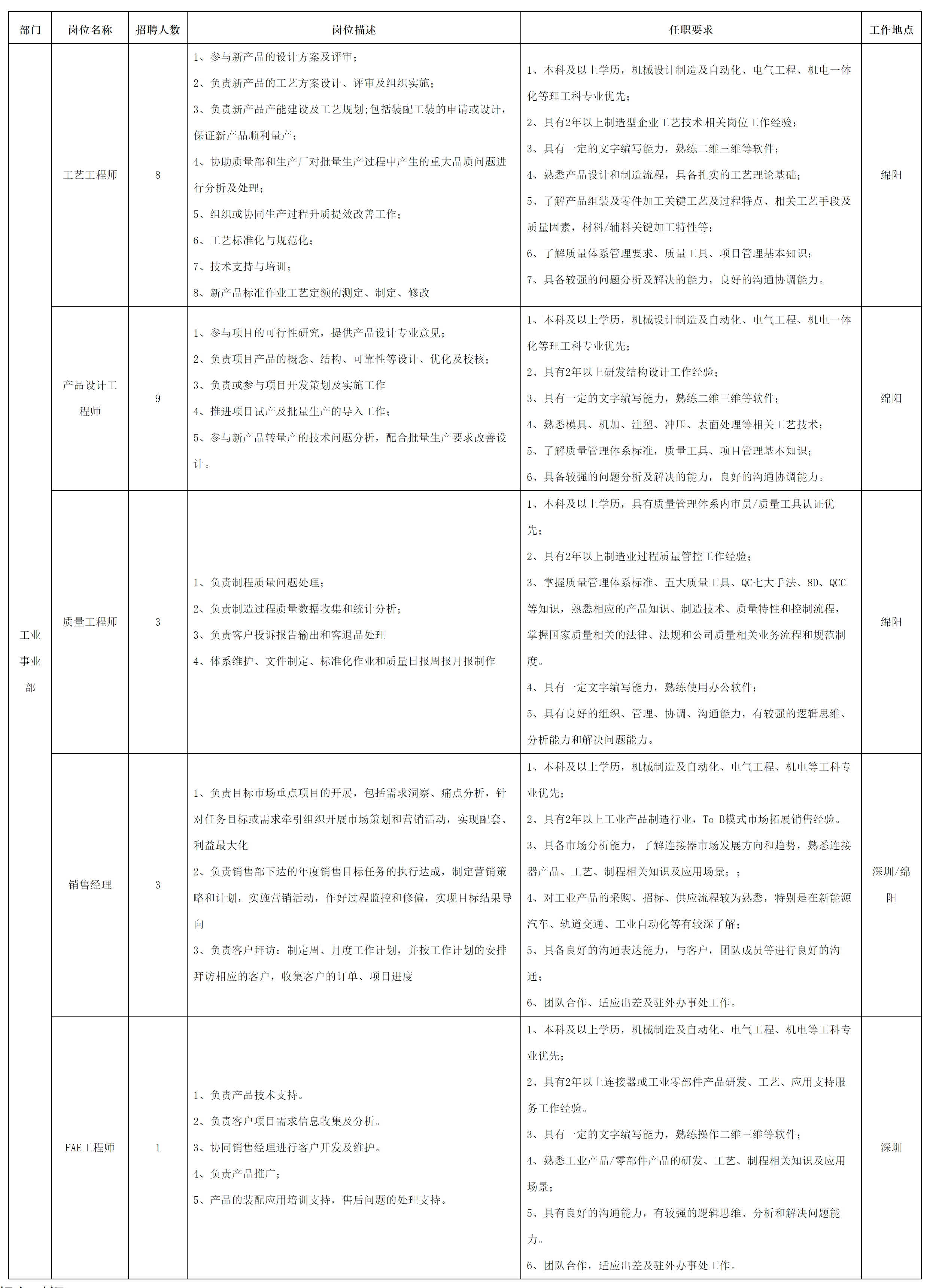 现因公司经营发展需要,现面向长虹集团内部、外部诚聘工艺工程师等岗位人员,具体岗位招聘信息公告如下: