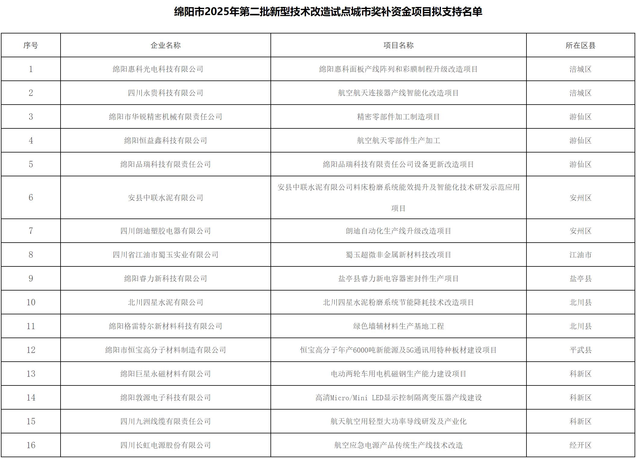 根据财政厅、经济和信息化厅工作安排,按照绵阳市经济和信息化局《关于做好绵阳市2025年第二批新型技术改造试点城市奖补资金项目申报的通知》(绵经信技改〔2025〕179号)、《关于补充征集绵阳市2025年第二批新型技术改造试点城市奖补资金项目申报的通知》(绵经信技改〔2025〕195号)要求,通过企业自主申报,县(市、区)、园区工业经济主管部门初审推荐,经相关科室审核、专家评审、现场核实、征求相关行业主管部门意见和市经信局党组会审议等程序,现对拟支持的16个项目名单予以公示。