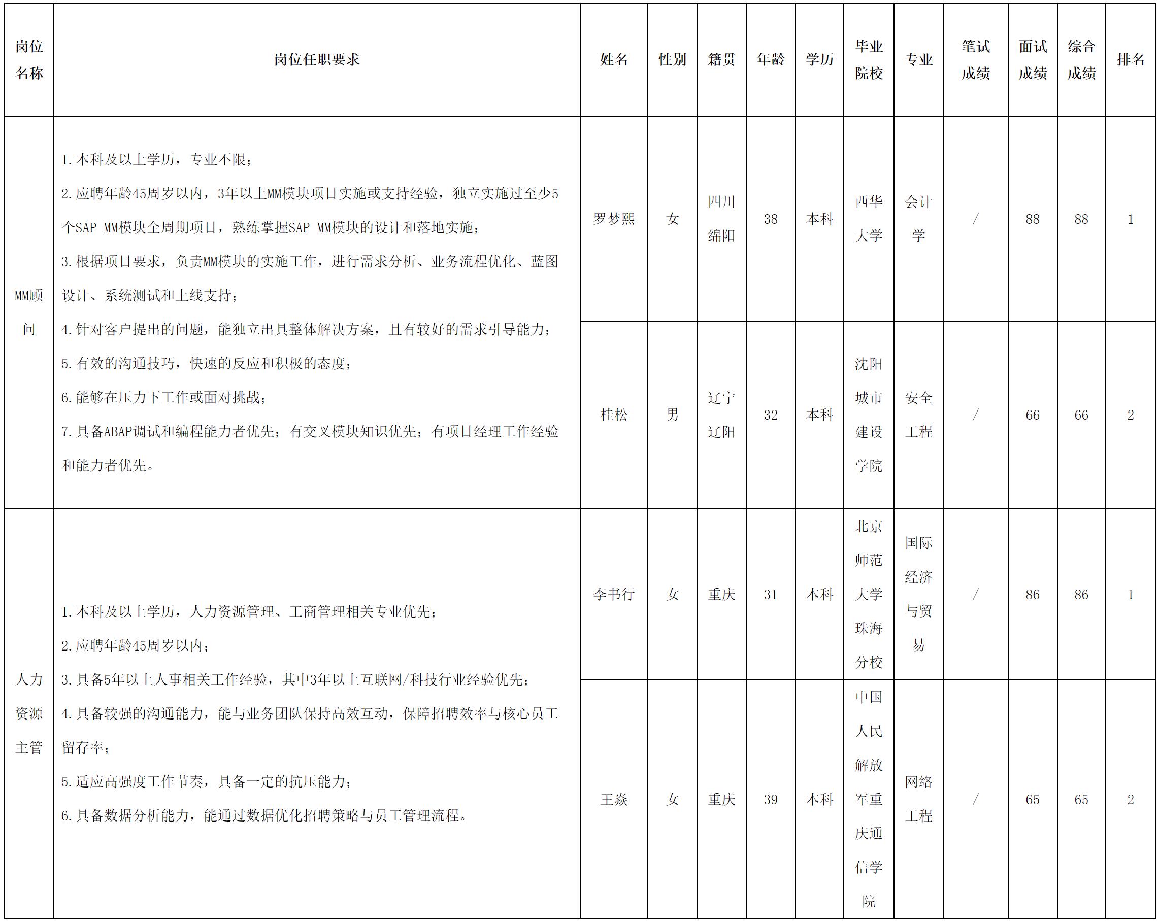 根据四川虹信软件股份有限公司发布的招聘公告及招聘相关规定,经面试等程序,现将测试成绩予以公示。