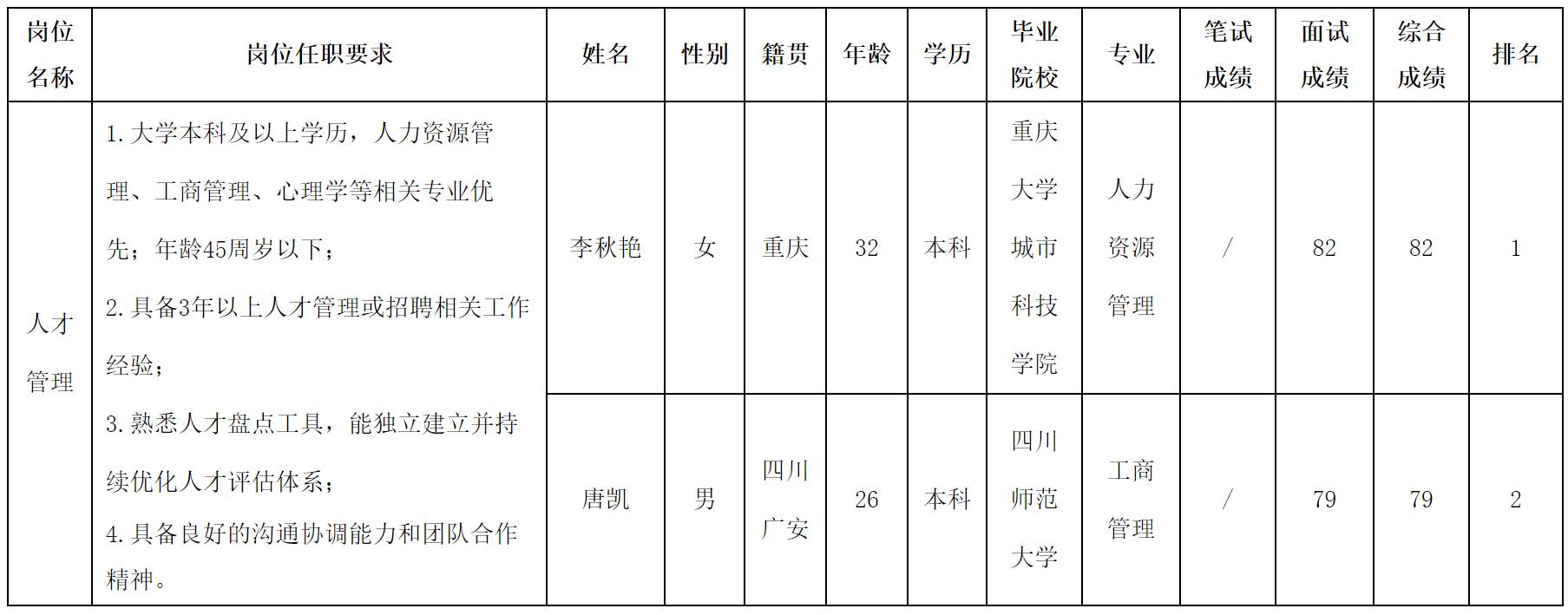 根据四川华丰科技股份有限公司发布的招聘公告及招聘相关规定,经面试等程序,现将测试成绩予以公示。