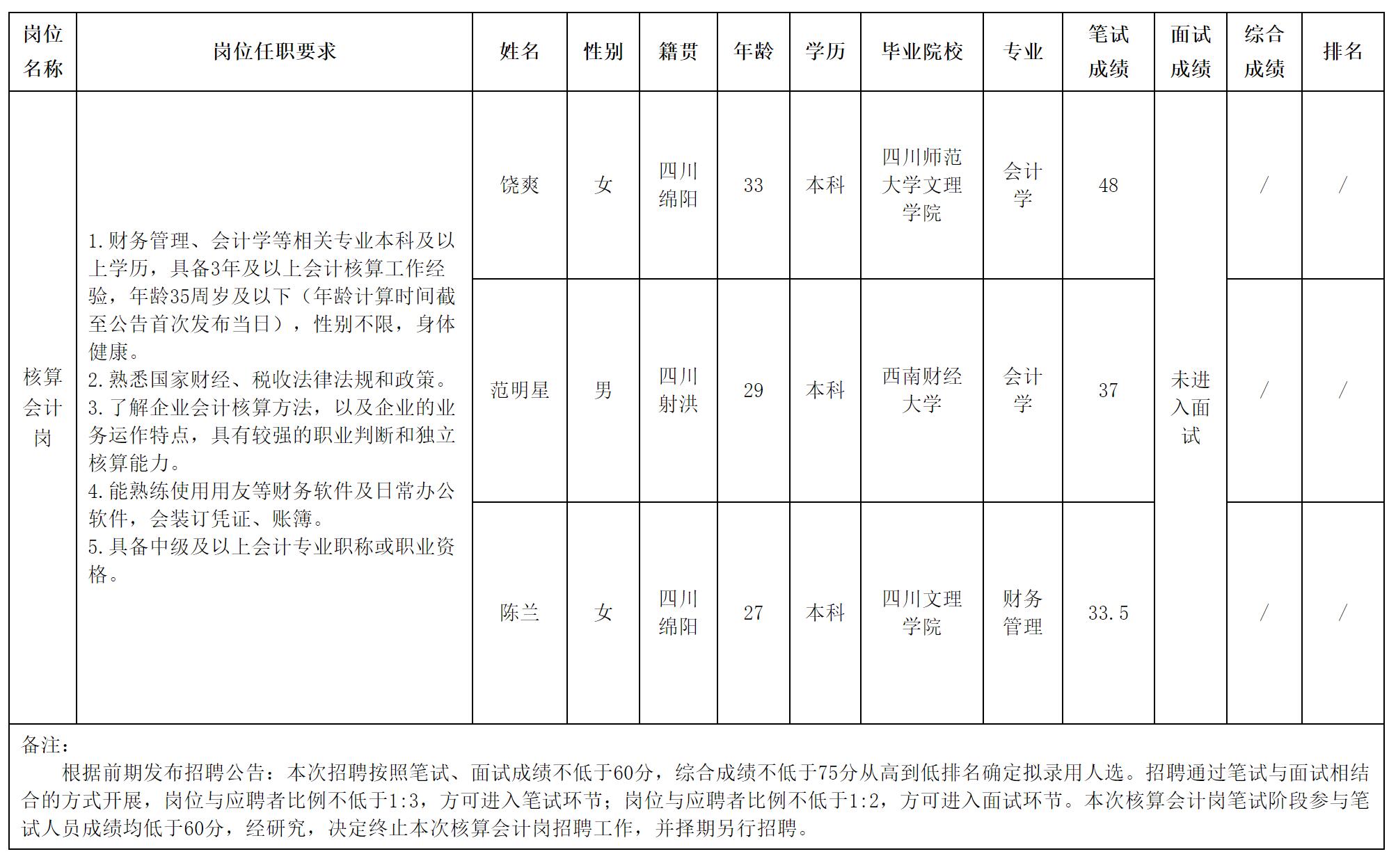 根据四川西津物流有限责任公司发布的招聘公告及招聘相关规定,经笔试,现将笔试成绩予以公示。