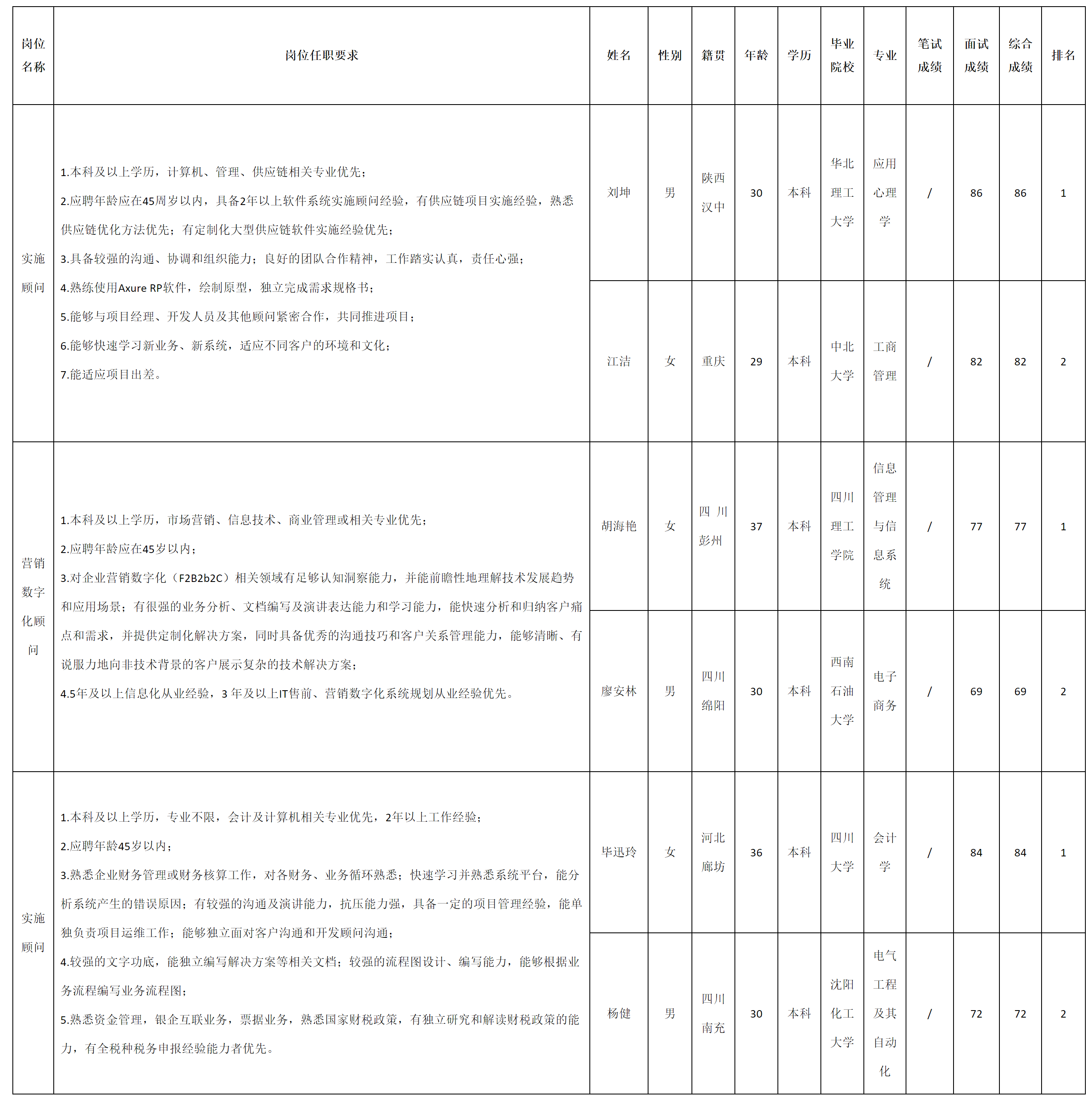 根据四川虹信软件股份有限公司发布的招聘公告及招聘相关规定,经面试等程序,现将测试成绩予以公示。