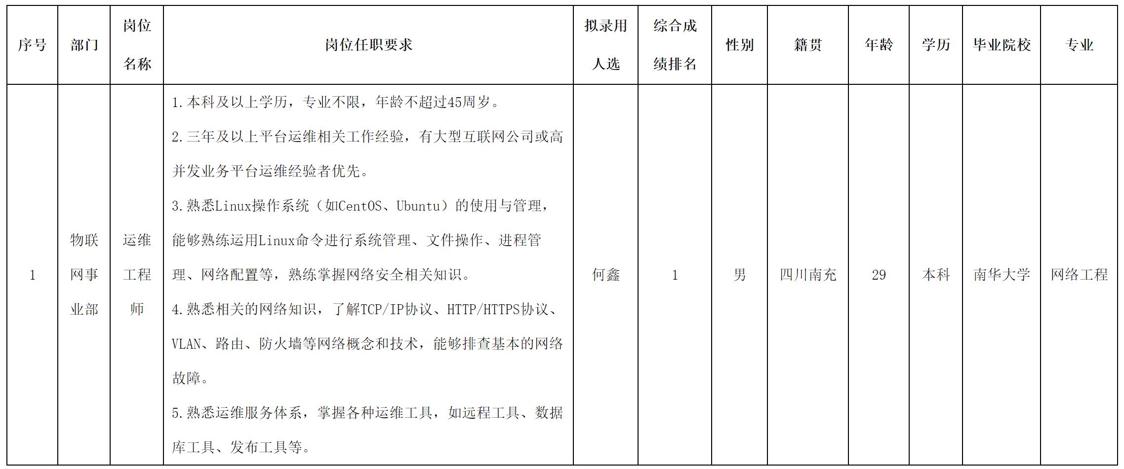 根据四川长虹新网科技有限责任公司发布的招聘公告及招聘相关规定,经面试、考察、体检等程序,拟录用何鑫同志到公司工作,现予以公示,具体情况如下: