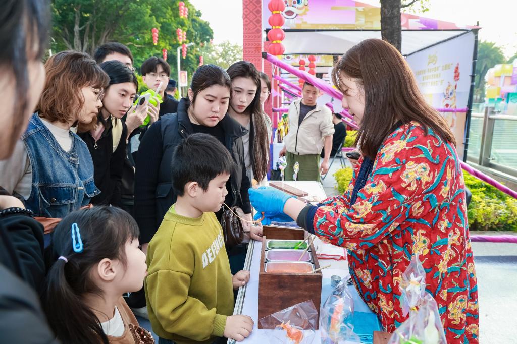 “慢慢吹,我来给你捏一个小猪。”在香港非物质文化遗产办事处的展位前,香港吹糖人师傅薛锦屏一边为游客介绍吹糖人的历史,一边用糖料捏成各种生动造型。“我很喜欢这次活动的氛围,除了让大家体验吹糖工艺,我也有机会去接触全国各地的非遗项目,和其他传承人相互交流。”薛锦屏说。
