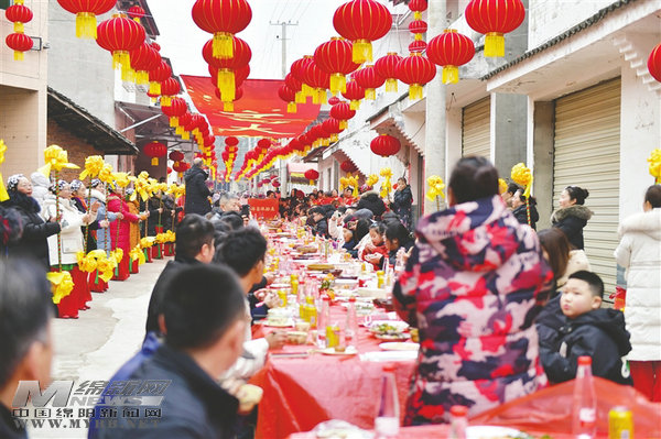 1月26日,盐亭县凤灵街道南街社区居民们聚在一起赏歌舞、品热粥、拓福字、吃长桌宴,拉近了邻里距离。 记者 彭紫薇 摄