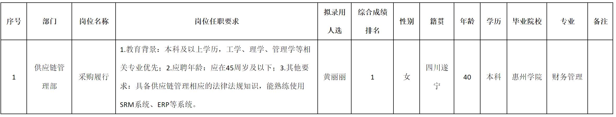 根据四川九州电子科技股份有限公司发布的招聘公告及招聘相关规定,经测试、考察、体检等程序,拟录用黄丽丽同志到四川九州电子科技股份有限公司工作,现予以公示,具体情况如下:
