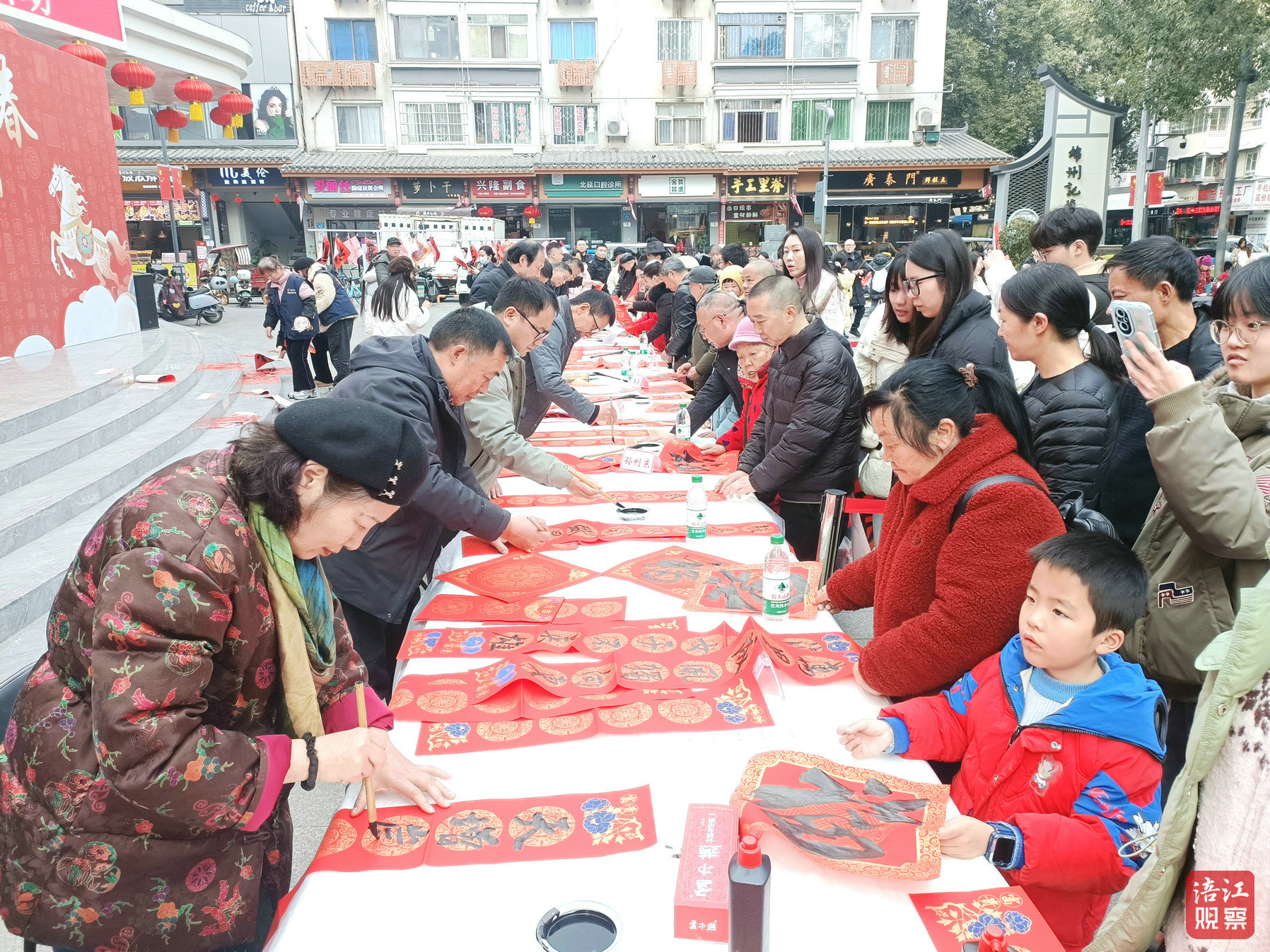 现场长桌排开,书法家们凝神聚气,笔走龙蛇。不一会儿,“春回大地千山秀,马跃长空万象新”“骏马奔腾开胜景,春风浩荡展宏图”等传统佳句跃然纸上,浓浓的墨香与鲜艳的红色交织,传递出对新一年的美好祈愿。