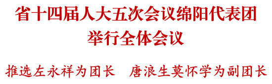 绵阳新闻网专电 2月2日,省十四届人大五次会议绵阳代表团在驻地举行全体会议,推选省委常委、市委书记左永祥为绵阳代表团团长,市人大常委会主任唐浪生和市委副书记、政法委书记莫怀学为副团长。