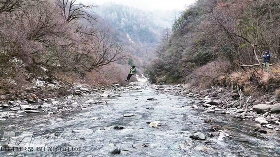 循着水声走向泗耳沟深处,队伍攀爬近乎垂直的陡坡,踏过覆冰的河滩,被一道30米宽的急流拦住了去路。