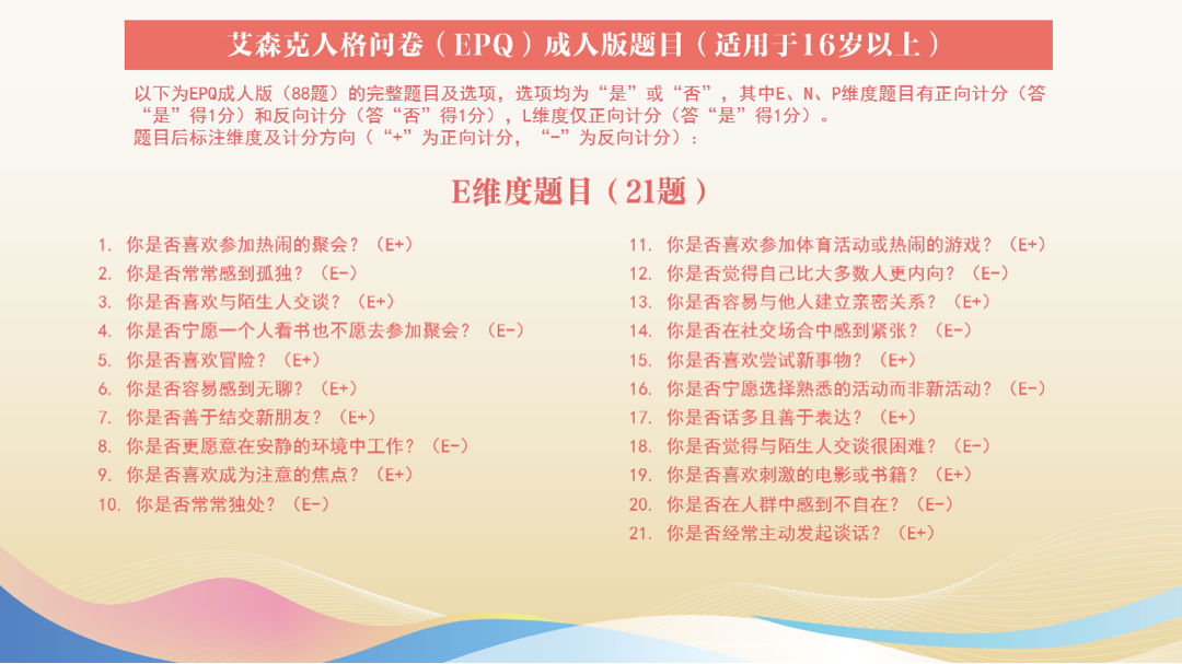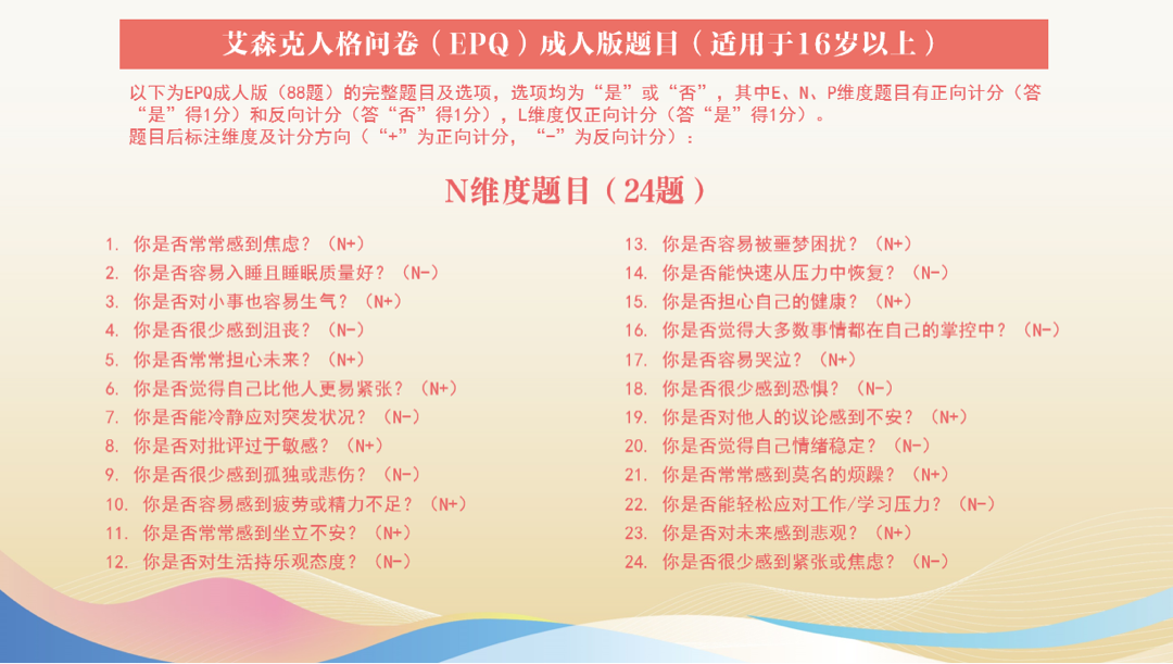 艾森克的人格问卷是用的比较多的一个测评,它分了四个维度,每个维度都有二十多道题,总共的这个问卷就有八十多道题。这样的评估跟那个图的评估相比,对于我们精神科医生来讲,我们会认为都不太可靠。比如这题问你是否担心自己的健康?我在做这个选项的时候,我可能会想,我勾选我担心自己的健康会不会被医生认为我有病,我就选什么,我就选不,我就选否。