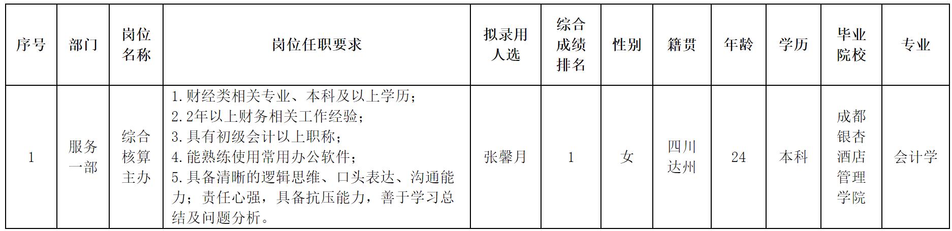 根据四川长虹电器股份有限公司财务云中心发布的招聘公告及招聘相关规定,经测试、考察、体检等程序,拟录用张馨月同志到公司工作,现予以公示,具体情况如下: