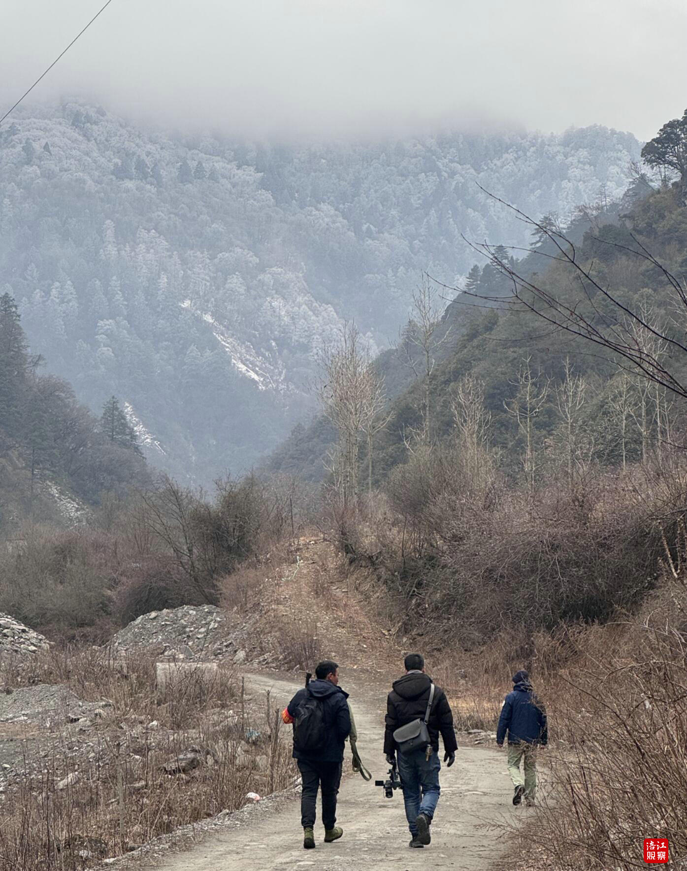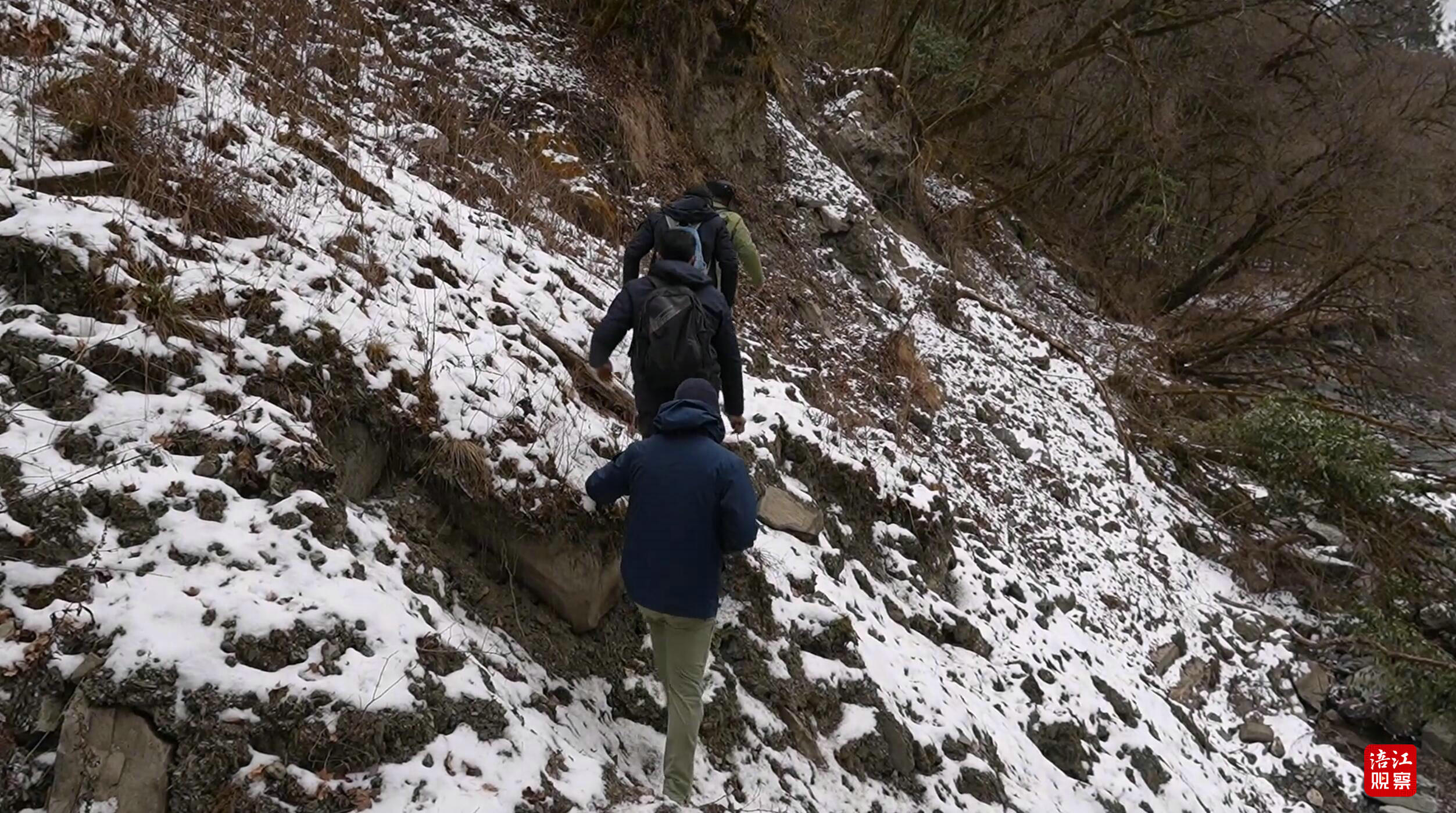 循着水声走向泗耳沟深处,巡护队伍攀爬上近乎垂直的陡坡,踏过覆冰的河滩,被一道三十米宽的急流拦住去路。