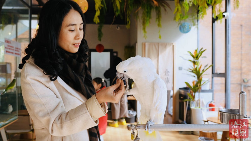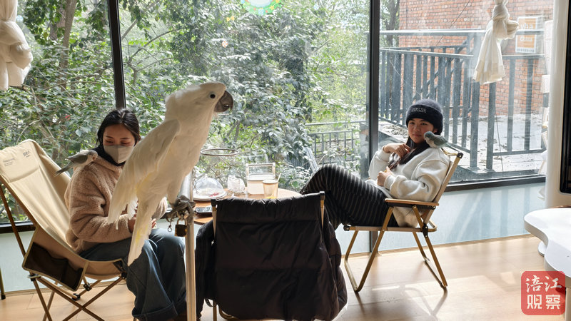 “猫咖狗咖都火出圈了,为啥不可以有鸟咖的一席之地呢?”走进园区内的有声鸟咖,店主黄娟一边照料鹦鹉,一边介绍她的创业初衷。店内,一棵大树贯穿两层小楼,七八种鹦鹉在二楼空间活动,不时落在客人肩头“搭话”。