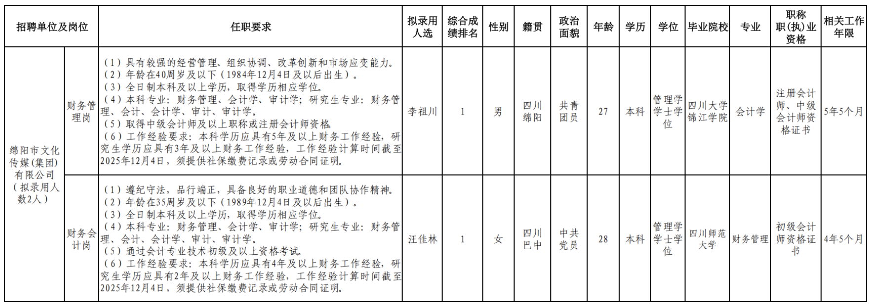 根据《绵阳市文化传媒(集团)有限公司关于招聘财务人员的公告》及招聘相关规定,经资格审查、综合测评(笔试+面试)、体检筛查、背景调查等程序,拟录用李祖川、汪佳林2人到绵阳市文化传媒(集团)有限公司工作。