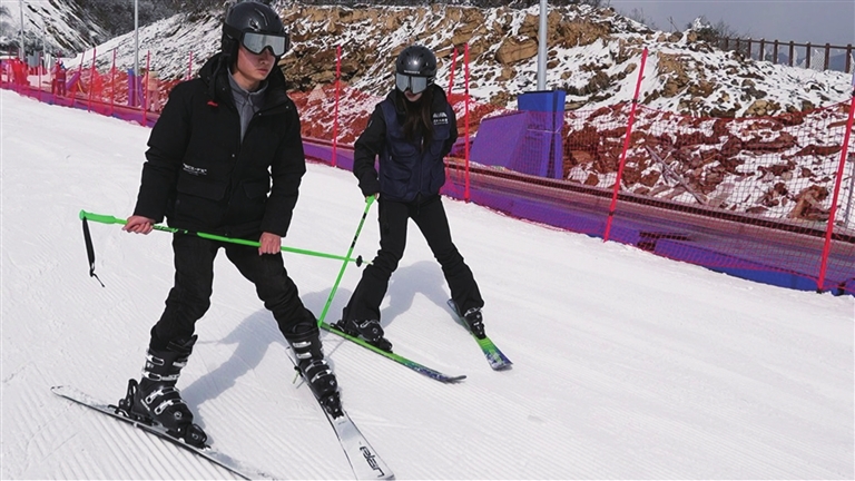 来自东北的滑雪教练(右)指导游客滑雪。记者 彭紫薇 摄