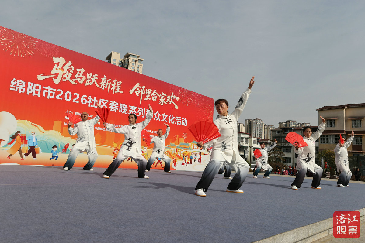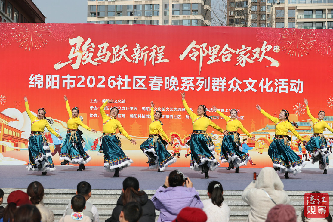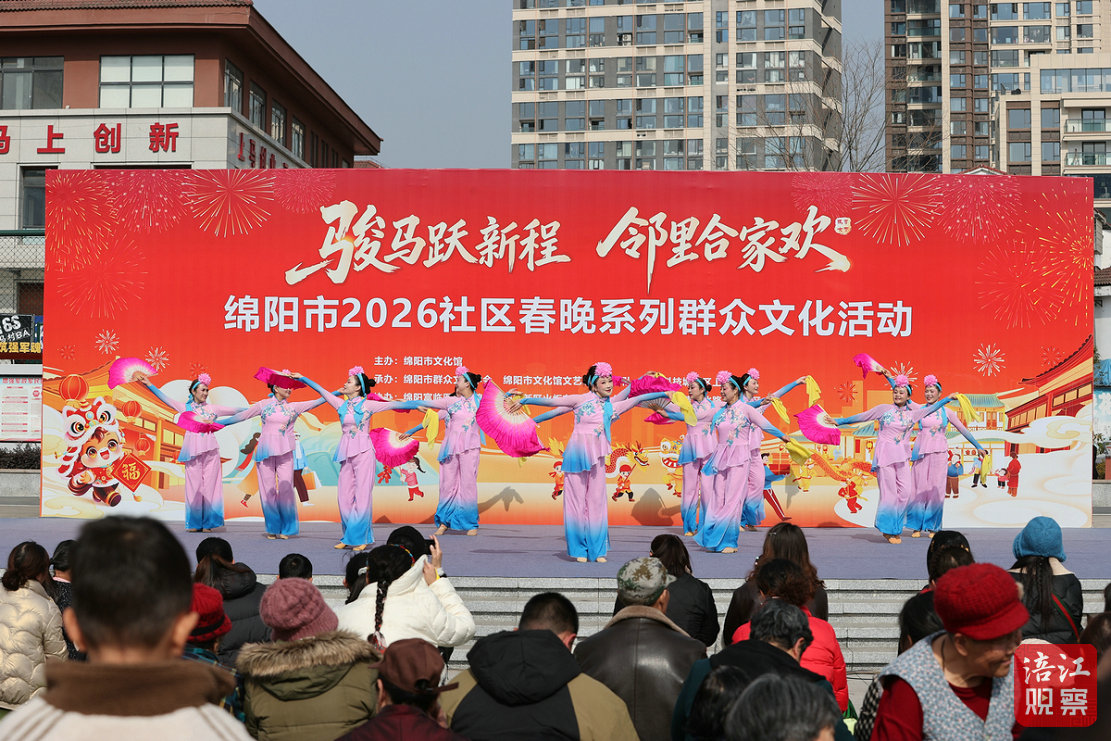 2月10日,久违的暖阳回归绵阳,“骏马跃新程 邻里合家欢”绵阳市2026社区春晚系列群众文化活动在上马文化广场举行,歌舞、合唱、独唱、器乐演奏、戏剧等轮番上演,为市民带来一场融合传统年味与邻里温情的新春文化大餐。