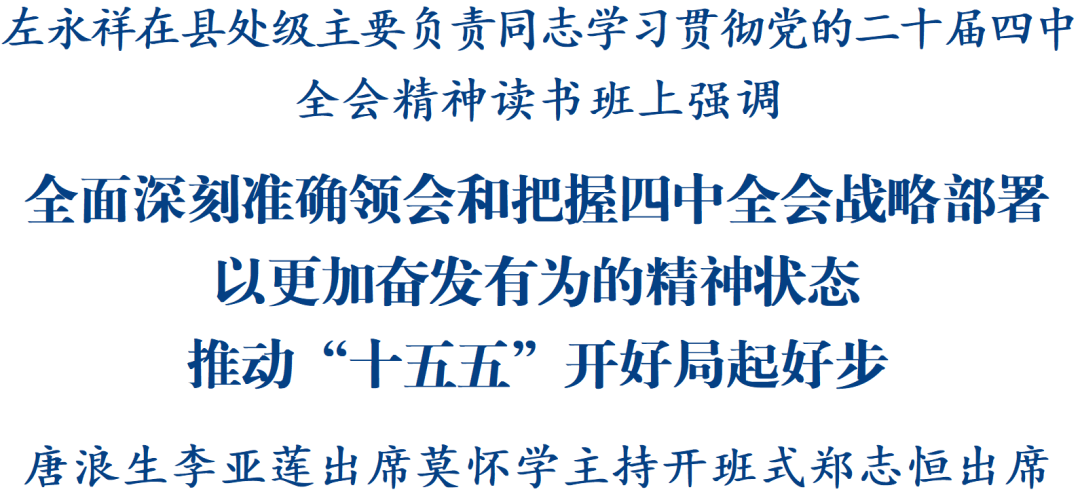 绵阳新闻网讯 2月8日至11日,县处级主要负责同志学习贯彻党的二十届四中全会精神读书班举行,省委常委、市委书记左永祥出席开班式并作主题报告。他强调,要深入学习贯彻习近平总书记在省部级主要领导干部专题研讨班上的重要讲话精神,全面深刻准确领会和把握四中全会战略部署,认真落实省委十二届八次全会、市委八届十一次全会部署要求,进一步统一思想、统一意志、统一行动,以更加奋发有为的精神状态推动“十五五”开好局、起好步。