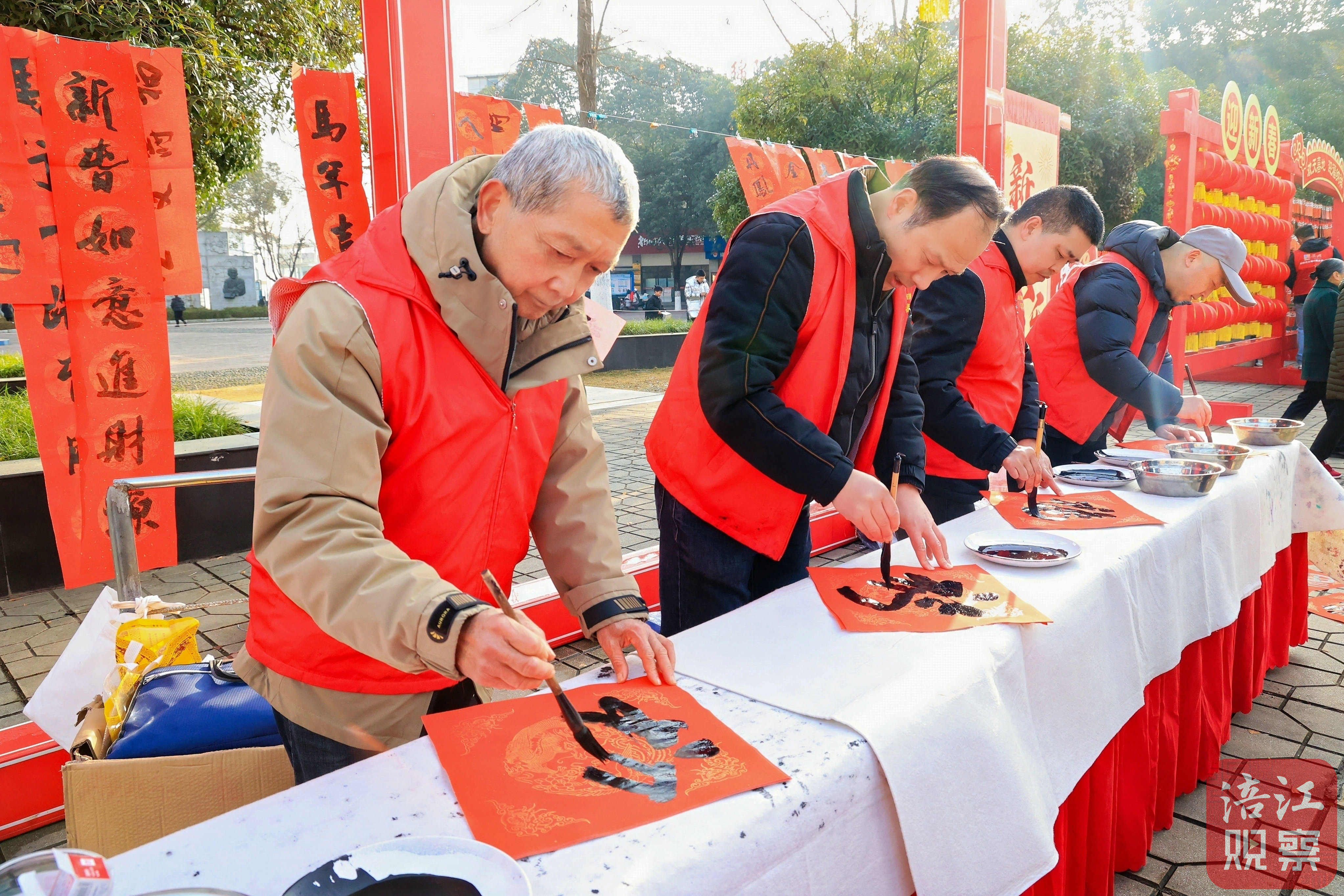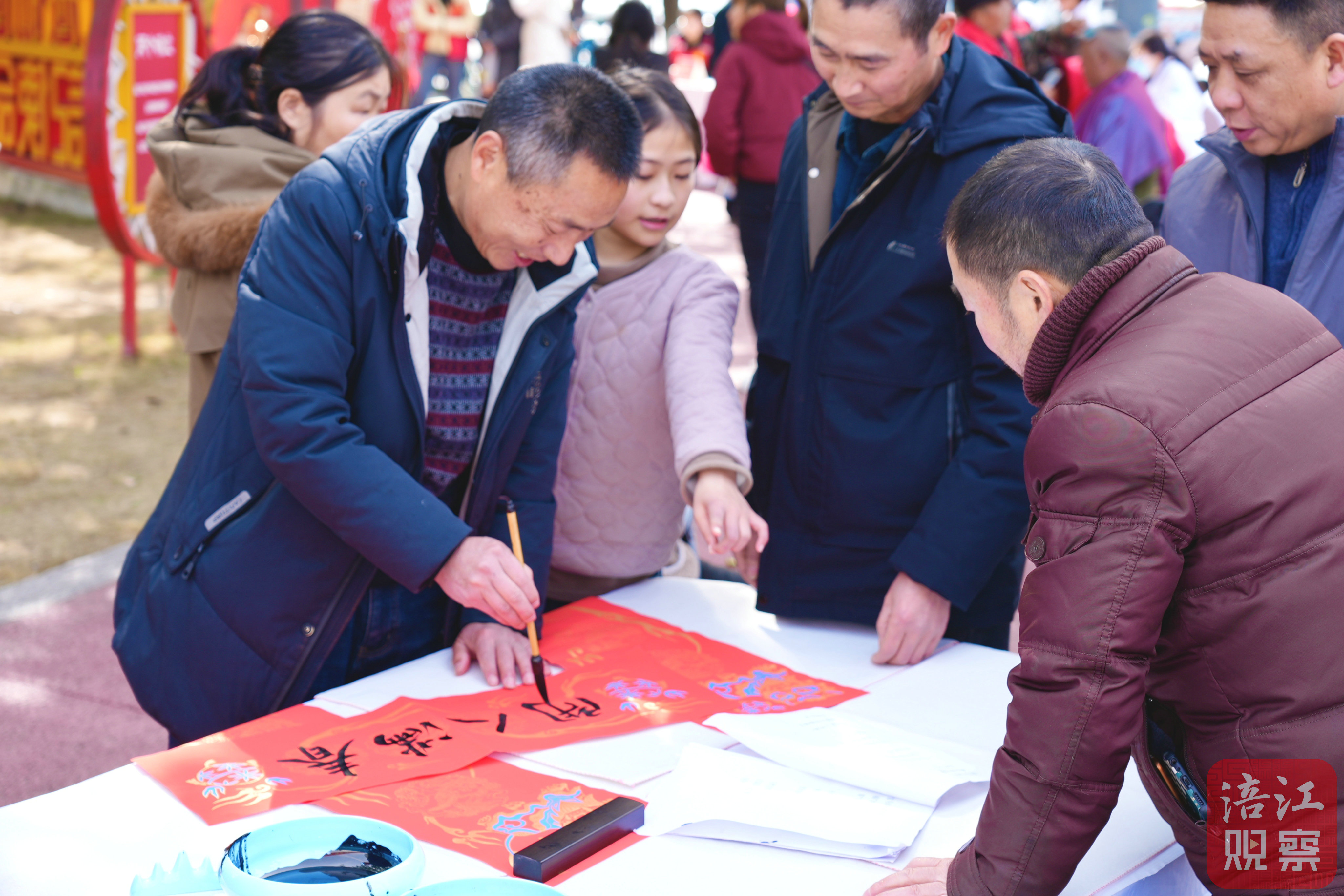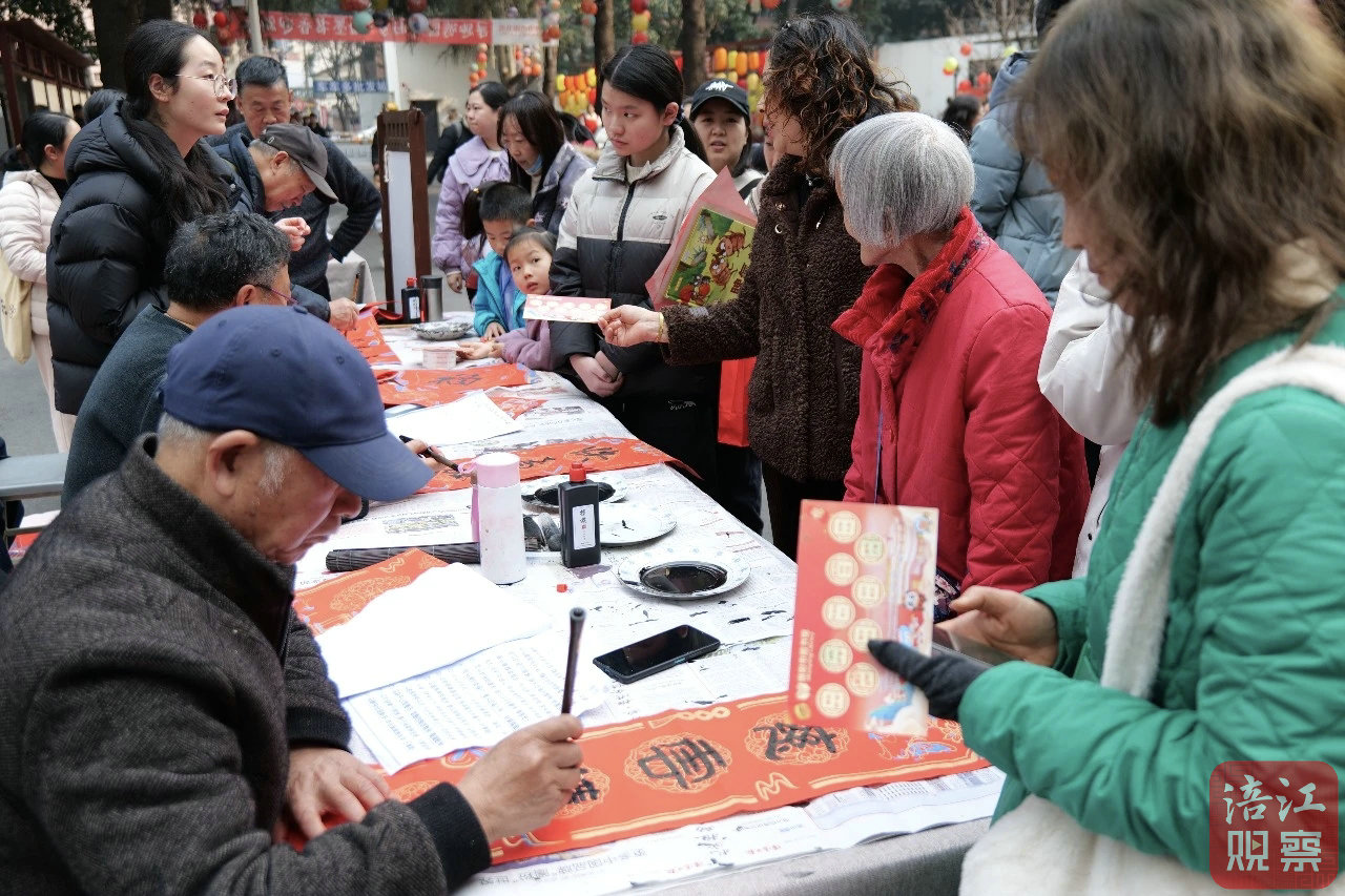 道路两侧,五彩斑斓的灯谜吸引着读者驻足凝思;雕版迎福区,读者亲身体验雕版印刷的独特魅力;“春联赠福”区,书法老师笔锋流转间,以遒劲笔墨书写新春的美好期许,为市民送上真挚祝福。
