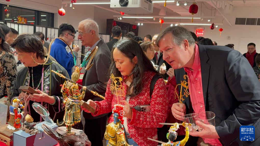 2月9日,在美国纽约曼哈顿南端的华美协进社中华美食烹饪中心,来宾欣赏面塑作品。新华社发(刘婧雯摄)