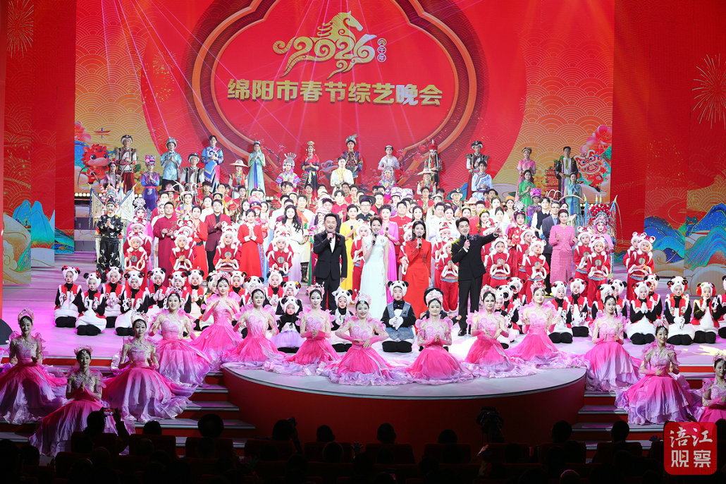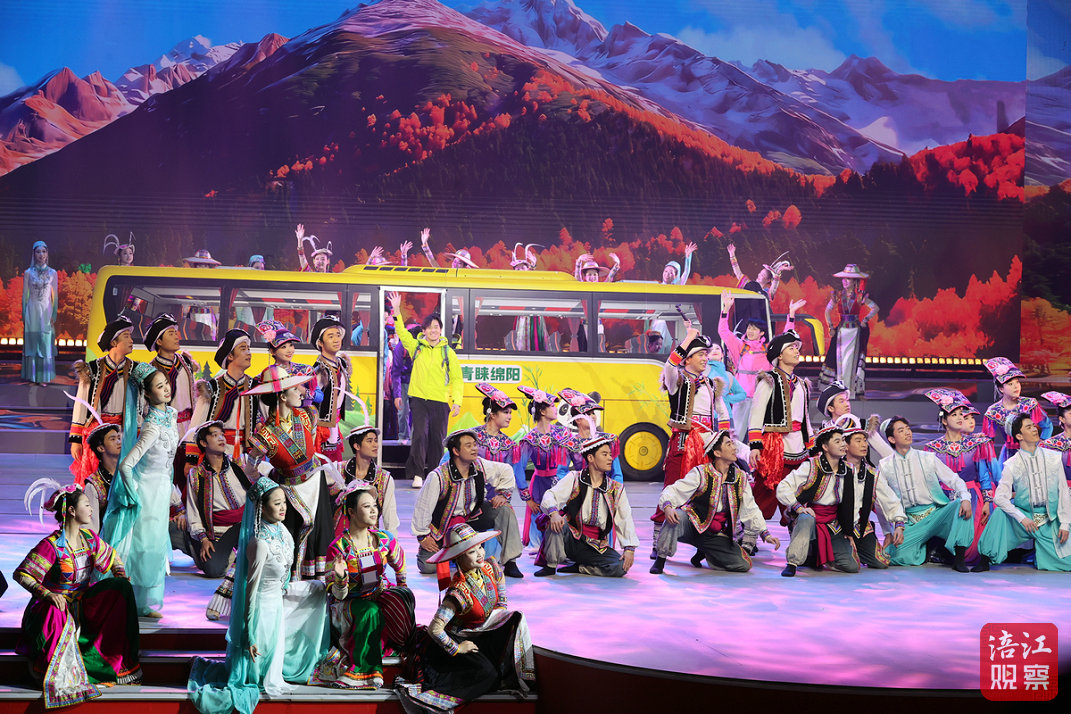 这种多元共生在节目编排中尤为显著:《绵州焕彩》篇章里川剧、非遗高台戏与机器人巧妙融合,《阳光大道》中白马藏族、羌族、回族歌舞与熊猫基地观光车无缝衔接。