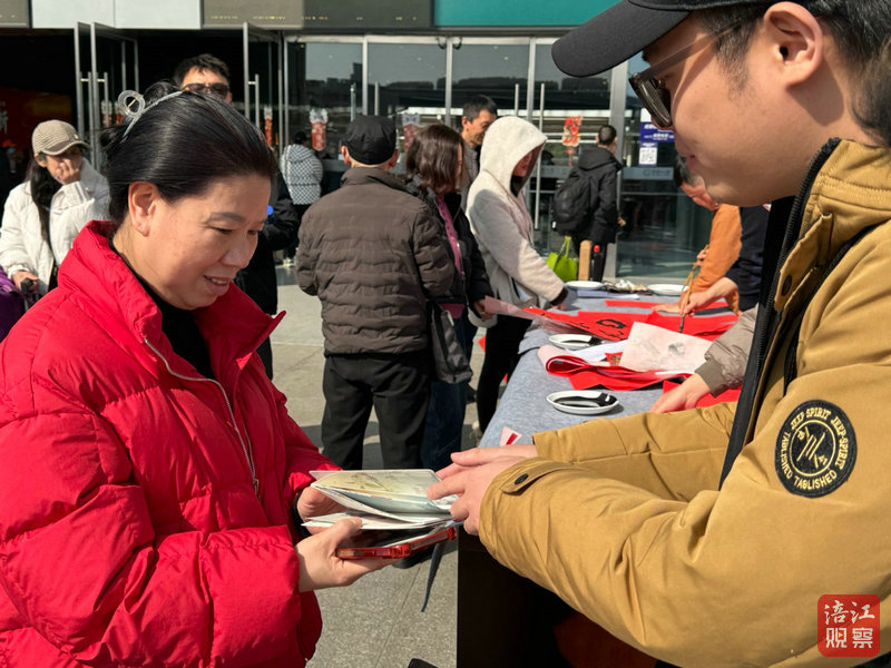 2月12日下午,绵阳火车站出口洋溢着浓浓的年味。红彤彤的新春展板、喜庆的背景音乐,还有桌上整齐摆放的手写春联和福字,吸引了不少刚下车的旅客驻足。这是绵阳文旅为迎接在外打拼的“总裁”“公主”们回家过年,特别策划的一场暖心活动——“欢迎总裁公主回绵阳过年”。