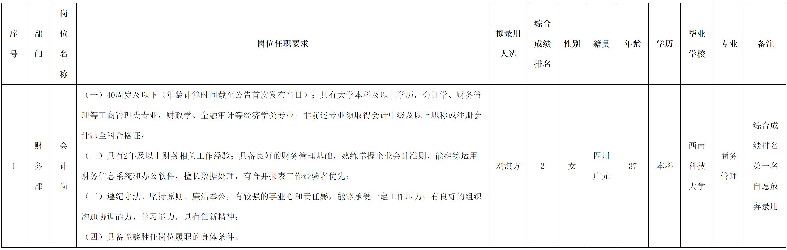 根据绵阳金控投资管理有限责任公司发布的招聘公告及招聘相关规定,经笔试、面试、背调、体检等程序,拟录用刘淇方到绵阳金控投资管理有限责任公司工作,现予以公示,具体情况如下: