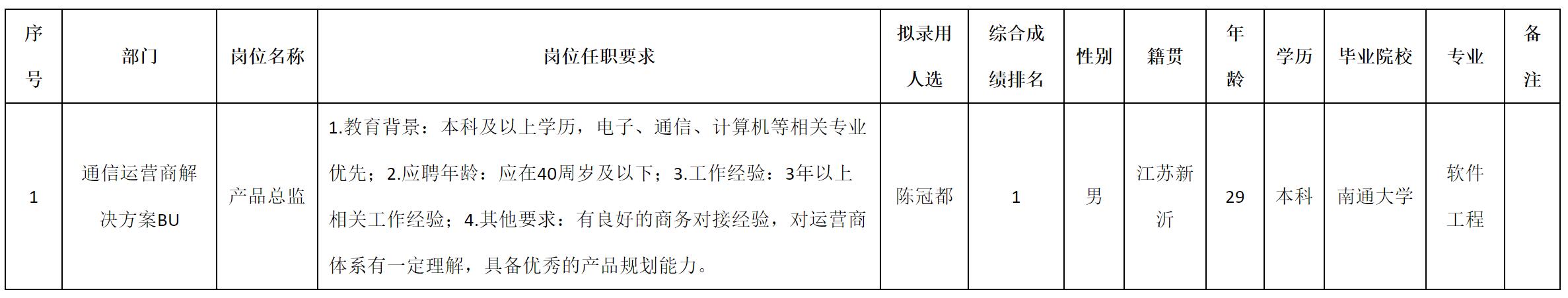 根据四川九州电子科技股份有限公司发布的招聘公告及招聘相关规定,经测试、考察、体检等程序,拟录用陈冠都同志到四川九州电子科技股份有限公司工作,现予以公示,具体情况如下: