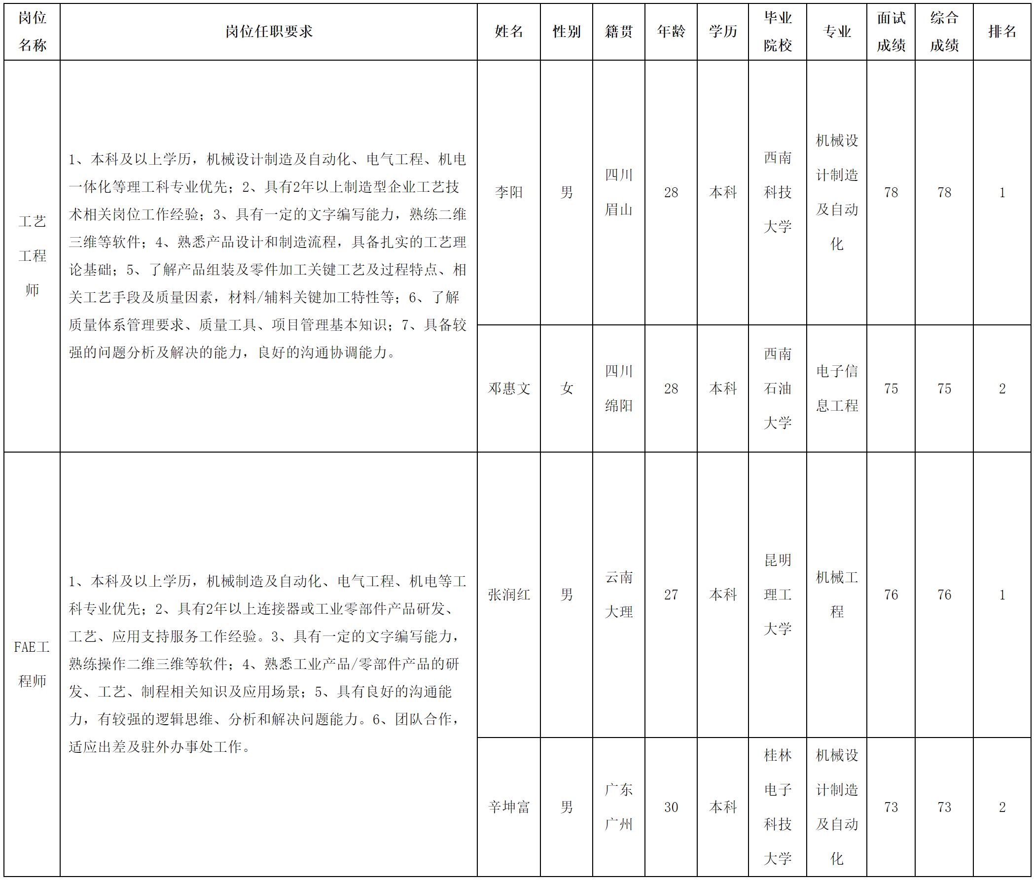 根据四川华丰科技股份有限公司发布的招聘公告及招聘相关规定,经面试等程序,现将测试成绩予以公示。