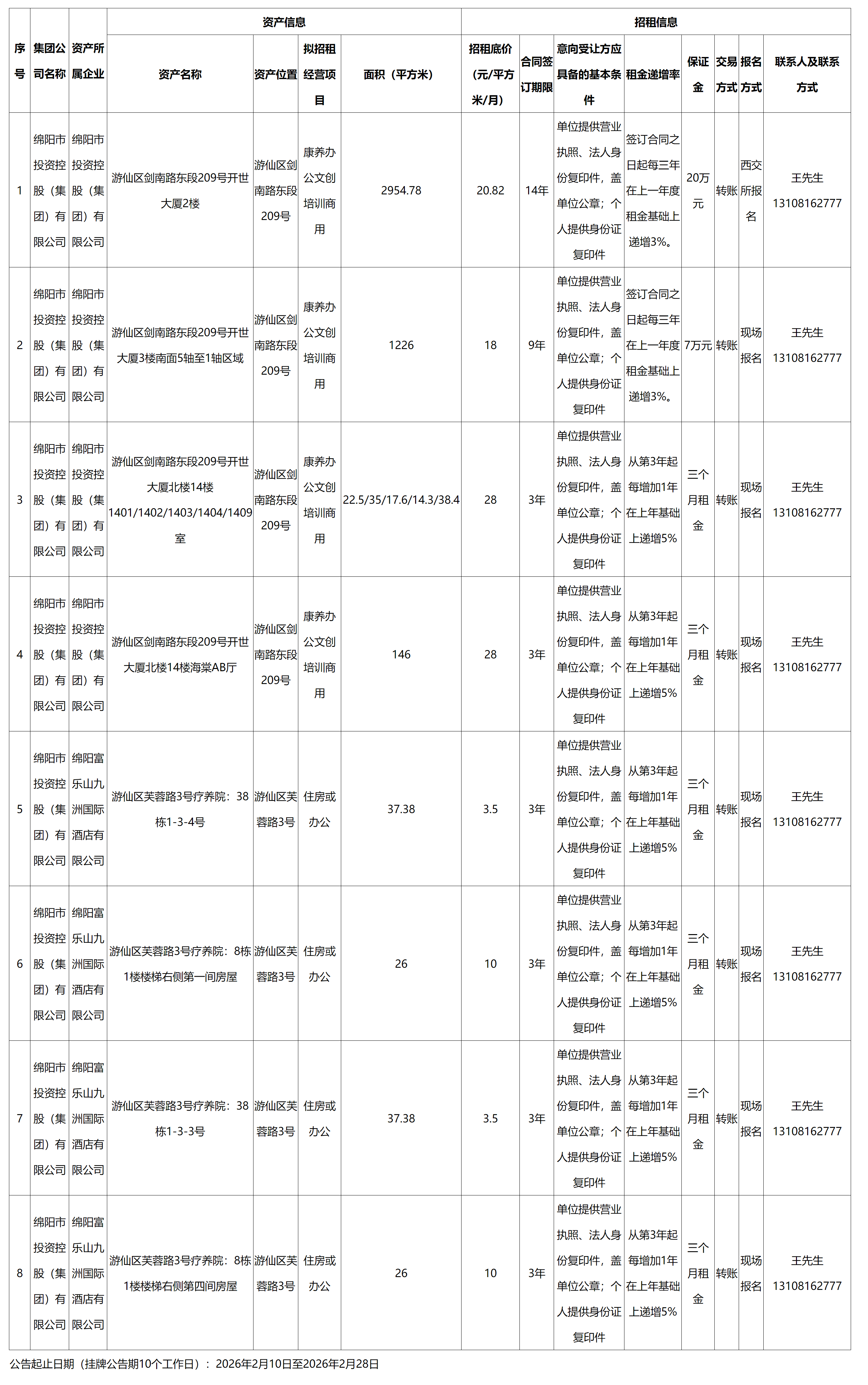 绵阳富乐山九洲国际酒店有限公司资产出租公告